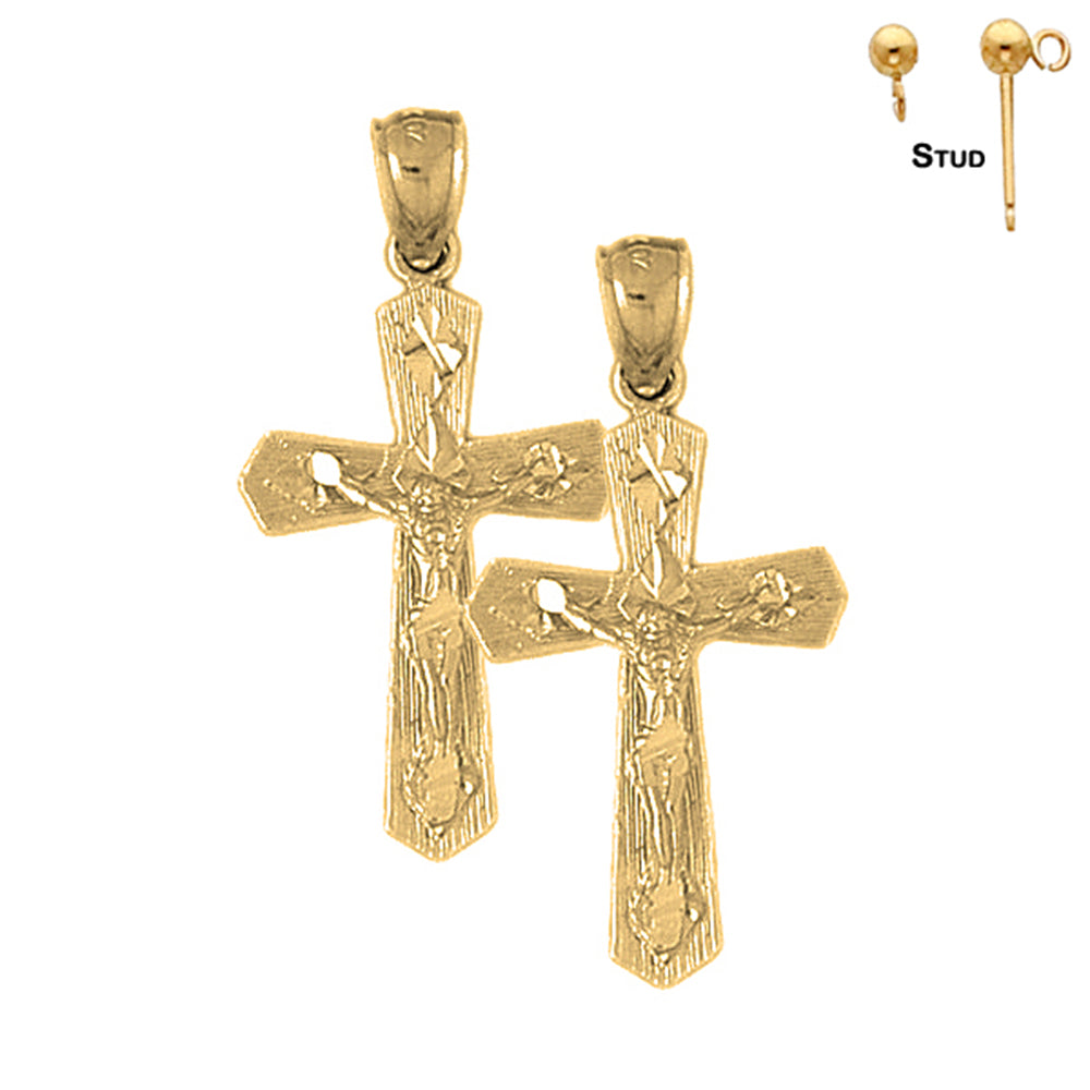 This is an elegant 14k yellow gold 37mm passion crucifix earrings. This 14k yellow gold earrings measures 37 mm in length by 20 mm width. JewelsObsession creates all gold jewelry in our state of the art manufacturing facility.