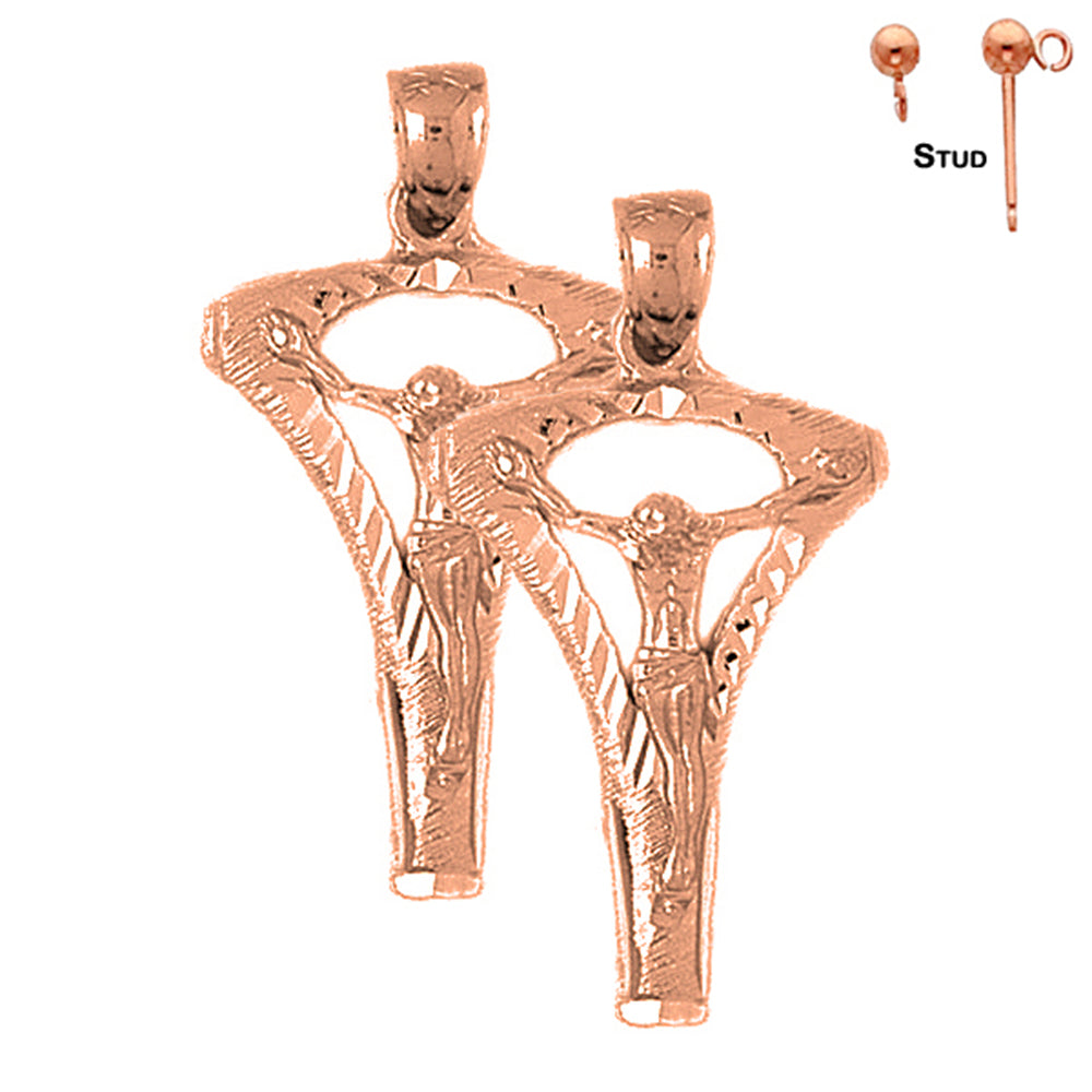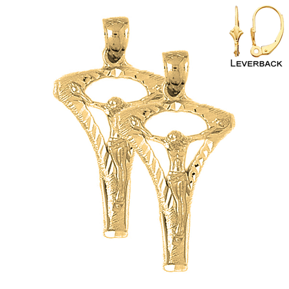 This is an elegant 14k yellow gold 39mm crucifix earrings. This 14k yellow gold earrings measures 39 mm in length by 22 mm width. JewelsObsession creates all gold jewelry in our state of the art manufacturing facility.