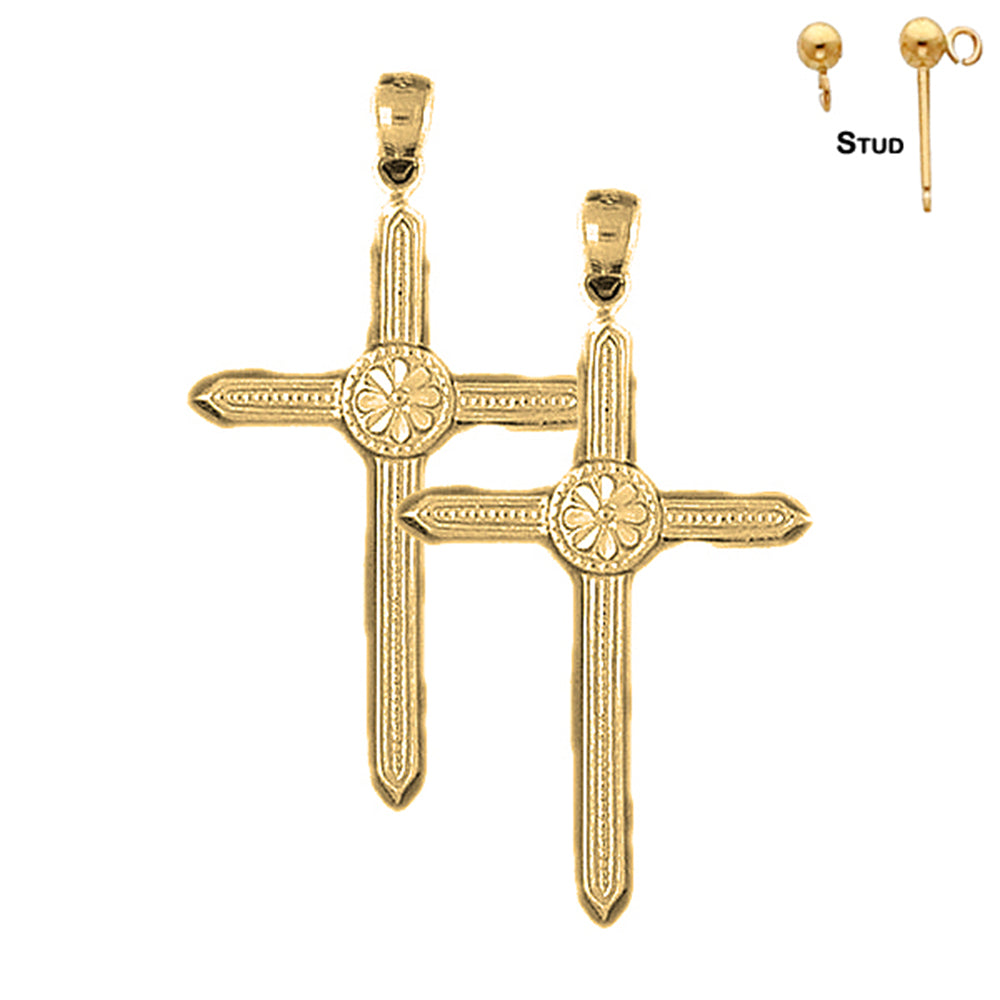 This is a stunning 14k yellow gold 43mm floral cross earrings. This 14k yellow gold earrings measures 43 mm in length by 25 mm width. JewelsObsession creates all gold jewelry in our state of the art manufacturing facility.