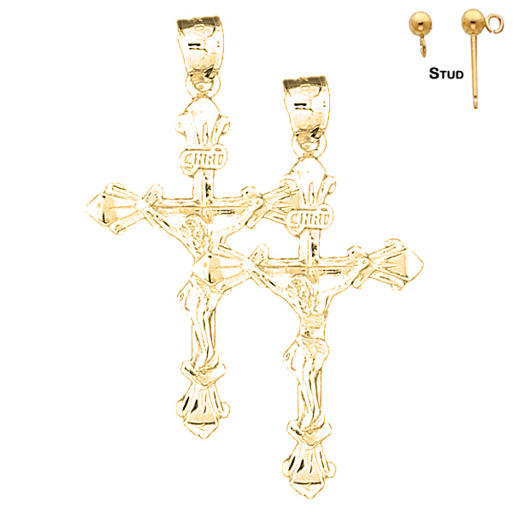 This is a beautiful 14k yellow gold 43mm inri crucifix earrings. This 14k yellow gold earrings measures 43 mm in length by 24 mm width. JewelsObsession creates all gold jewelry in our state of the art manufacturing facility.
