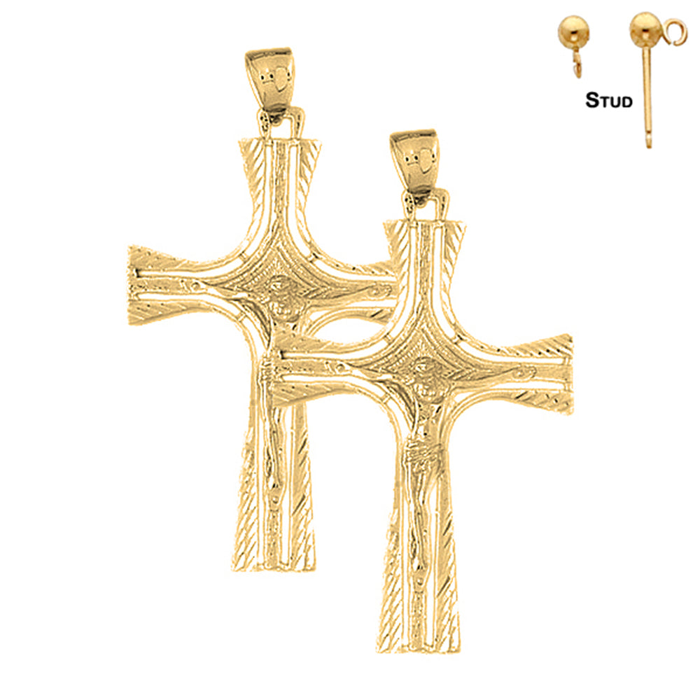 This is a beautiful 14k yellow gold 59mm latin crucifix earrings. This 14k yellow gold earrings measures 59 mm in length by 34 mm width. JewelsObsession creates all gold jewelry in our state of the art manufacturing facility.