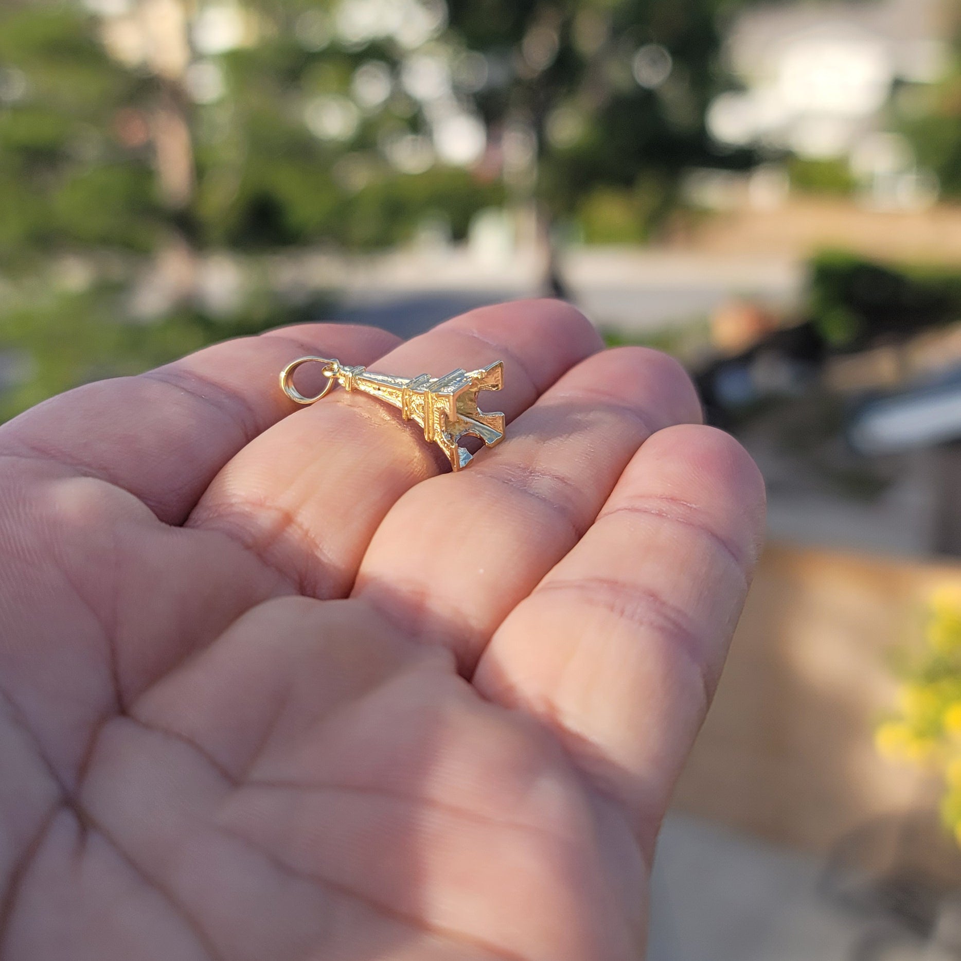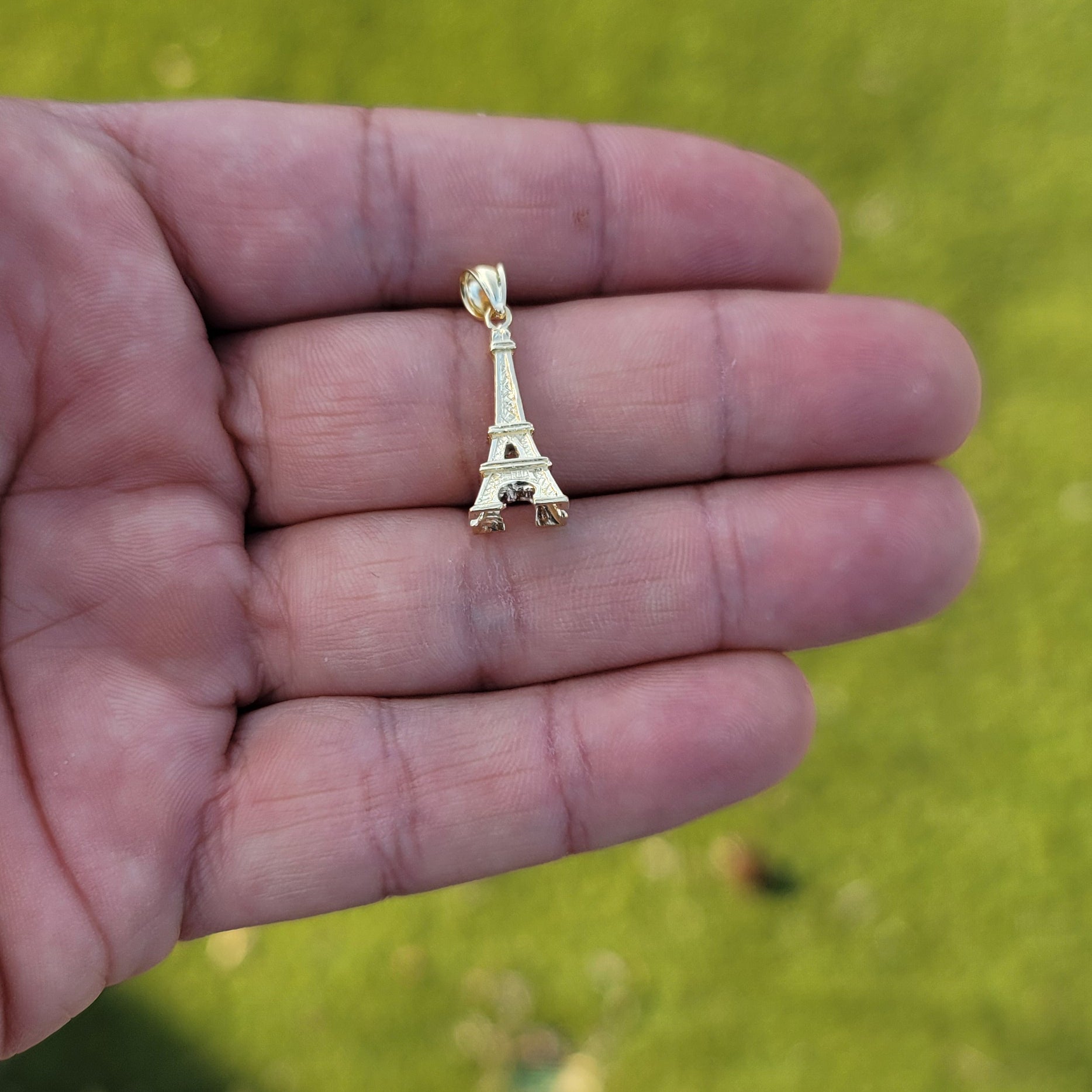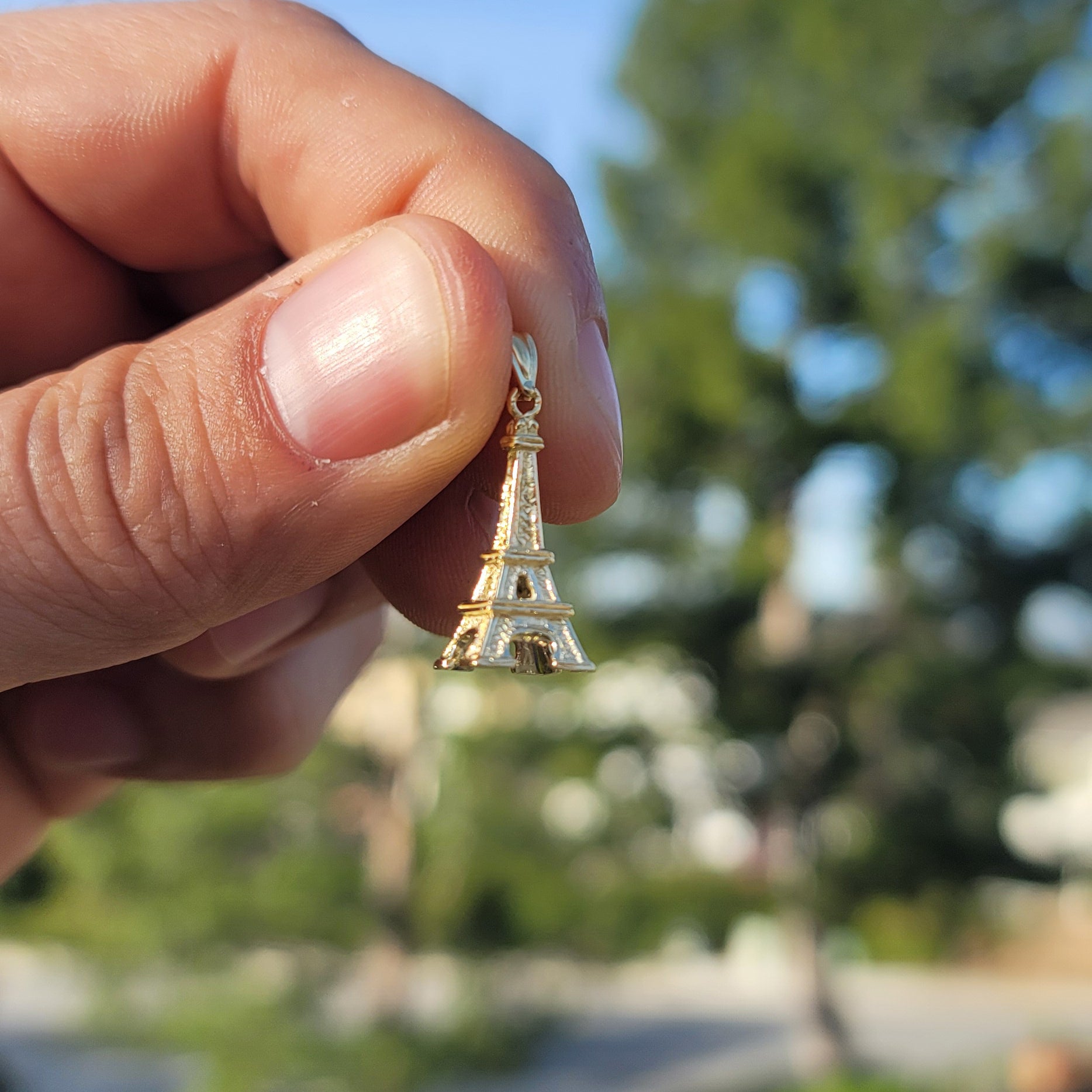 This is a stunning 14K or 18K gold 3-d eiffel tower pendant. This 14K or 18K gold pendant measures 25 mm in length by 10 mm in width. Measurement includes bale. JewelsObsession creates all gold jewelry in our state of the art manufacturing facility.