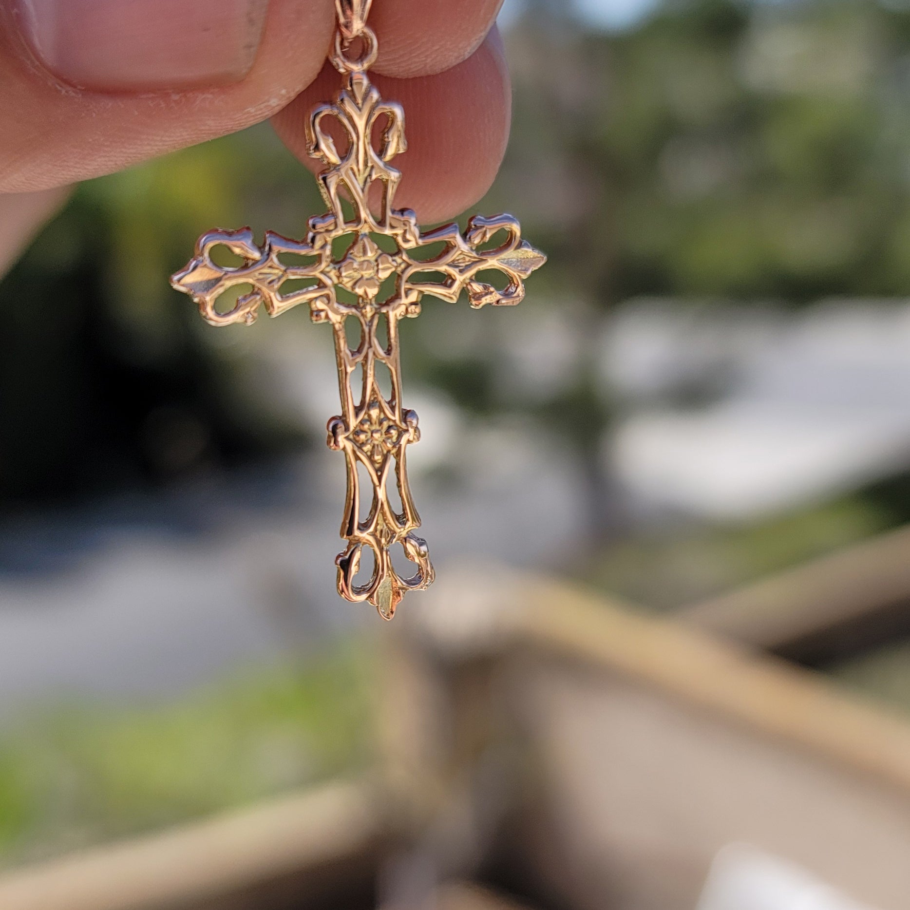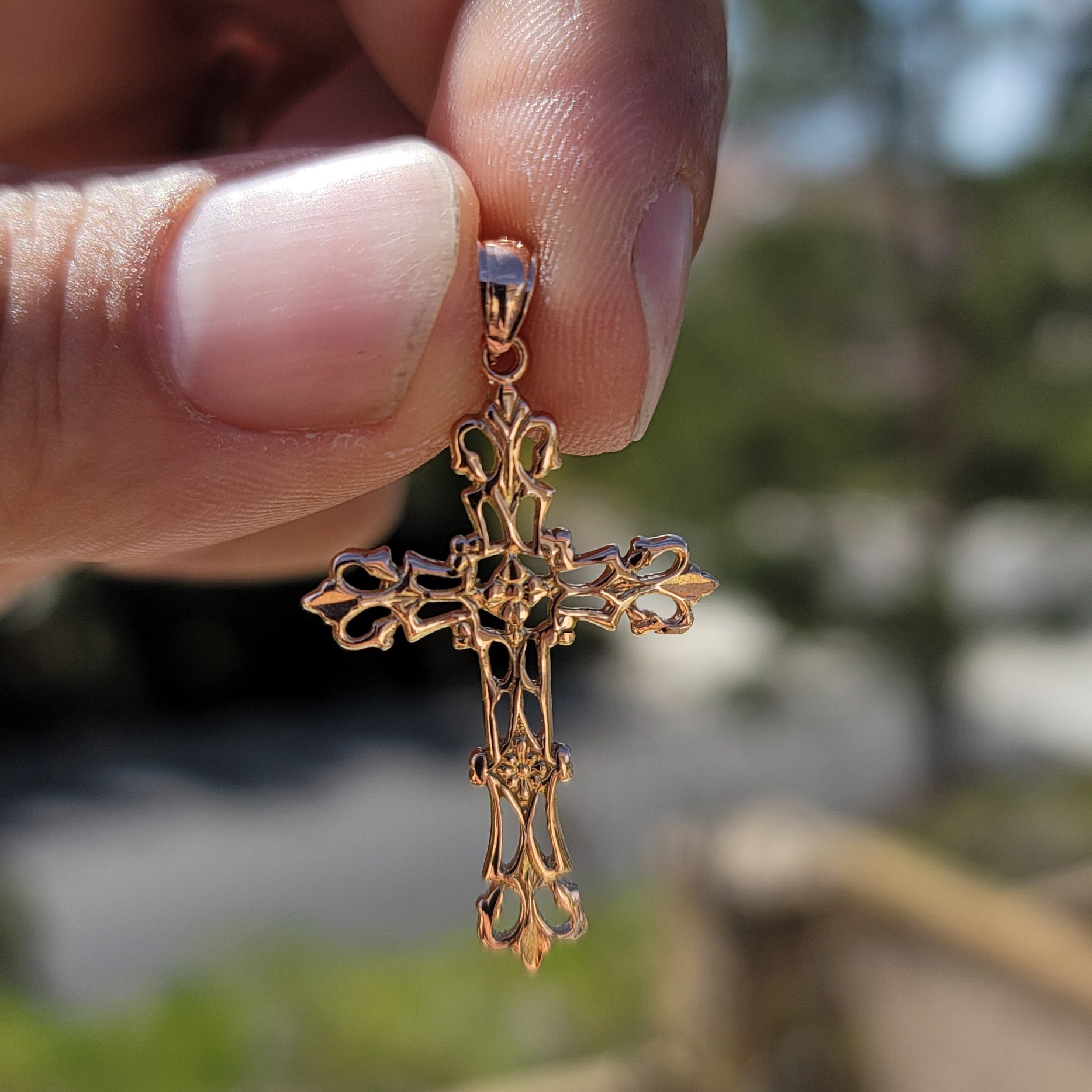 This is a beautiful 10K, 14K or 18K gold cross pendant. This 10K, 14K or 18K gold pendant measures 43 mm in length by 24 mm in width. Measurement includes bale. JewelsObsession creates all gold jewelry in our state of the art manufacturing facility.