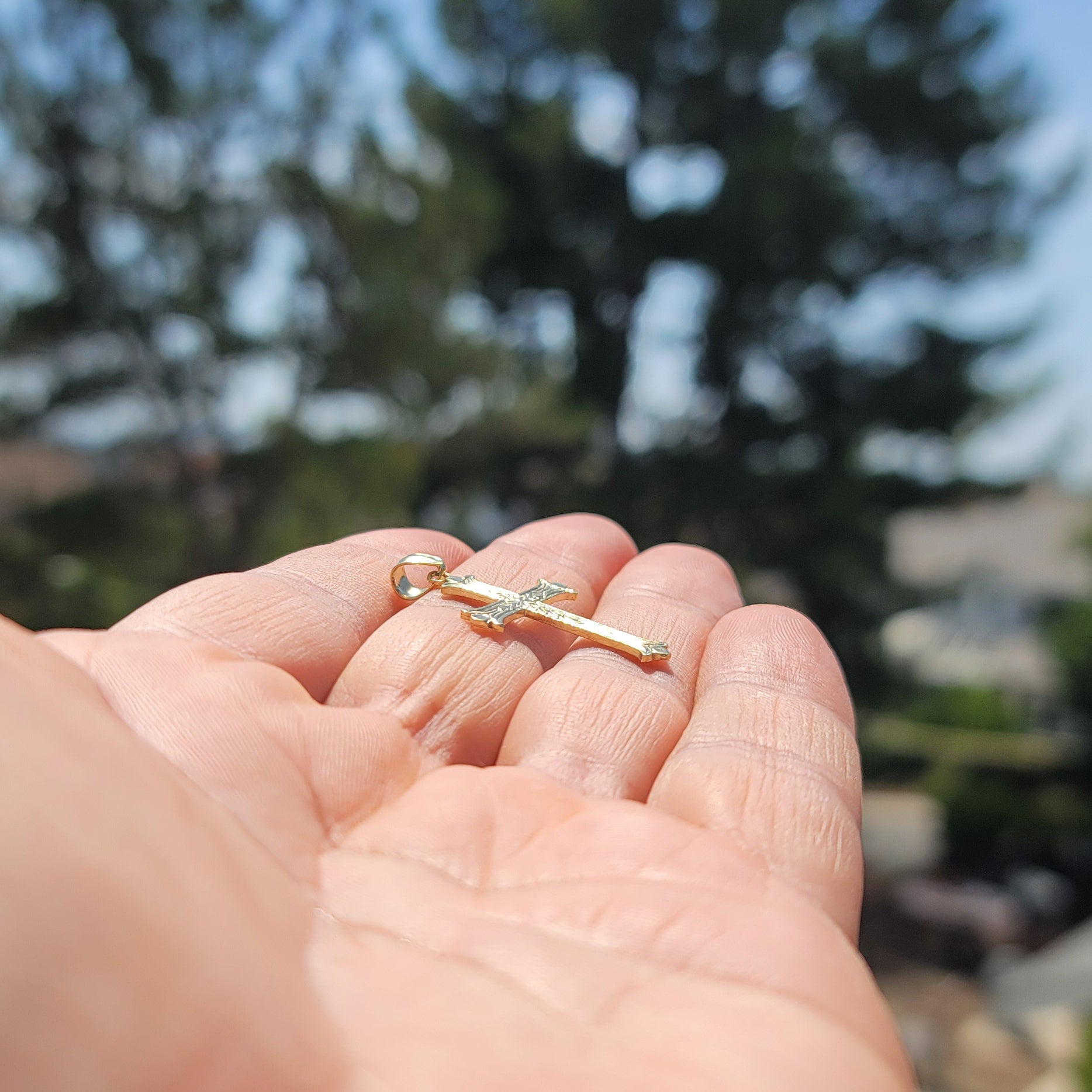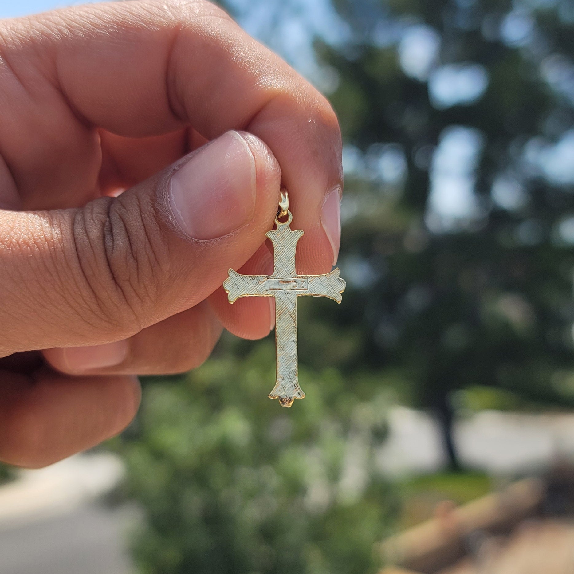 This gorgeous 14K or 18K gold cross pendant. This 14K or 18K gold pendant measures 33 mm in length by 19 mm in width. Measurement includes bale. JewelsObsession creates all gold jewelry in our state of the art manufacturing facility.
