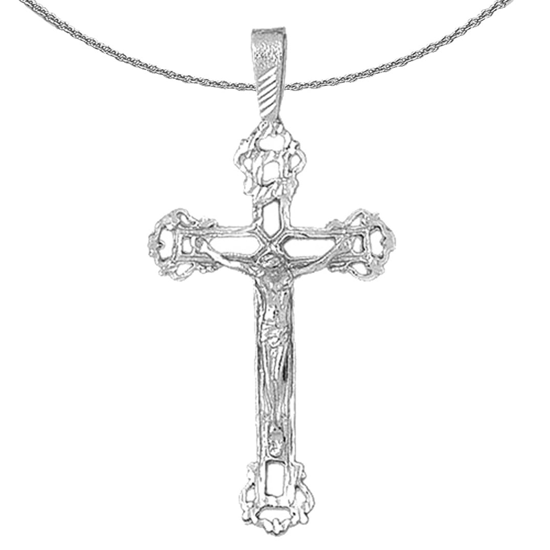 This is an elegant 10K, 14K or 18K gold crucifix pendant. This 10K, 14K or 18K gold pendant measures 61 mm in length by 30 mm in width. Measurement includes bale. JewelsObsession creates all gold jewelry in our state of the art manufacturing facility.