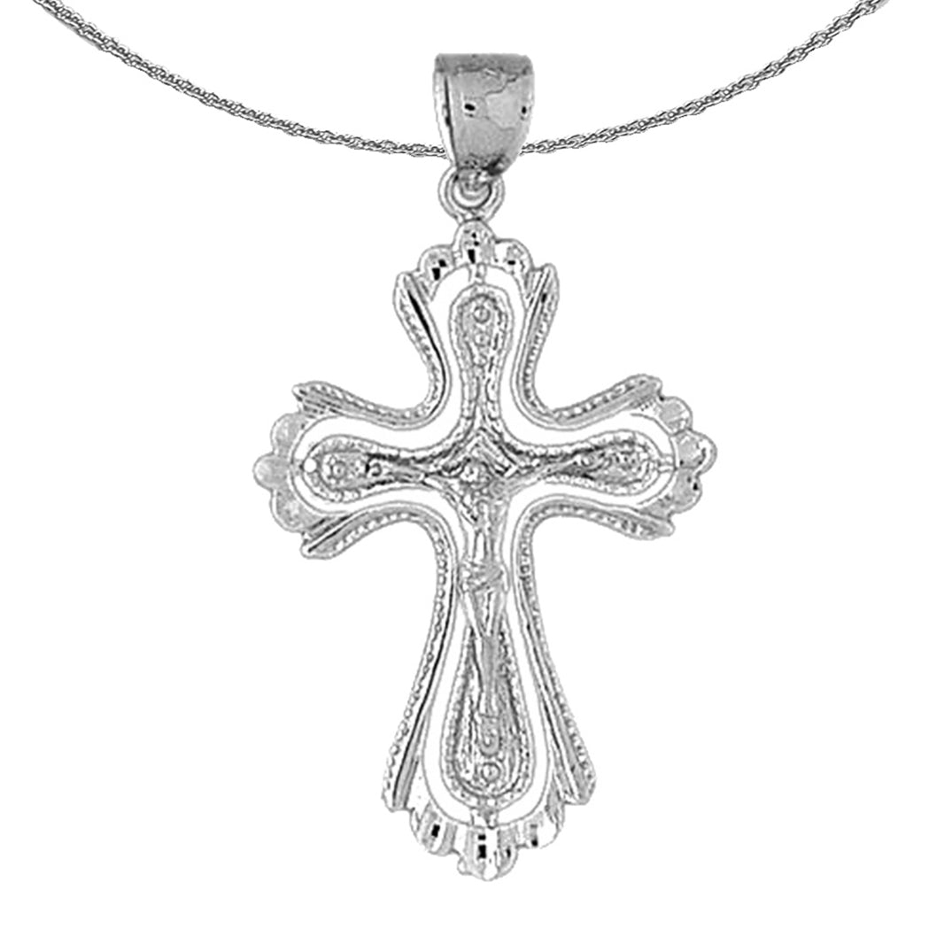 This gorgeous 10K, 14K or 18K gold crucifix pendant. This 10K, 14K or 18K gold pendant measures 48 mm in length by 26 mm in width. Measurement includes bale. JewelsObsession creates all gold jewelry in our state of the art manufacturing facility.