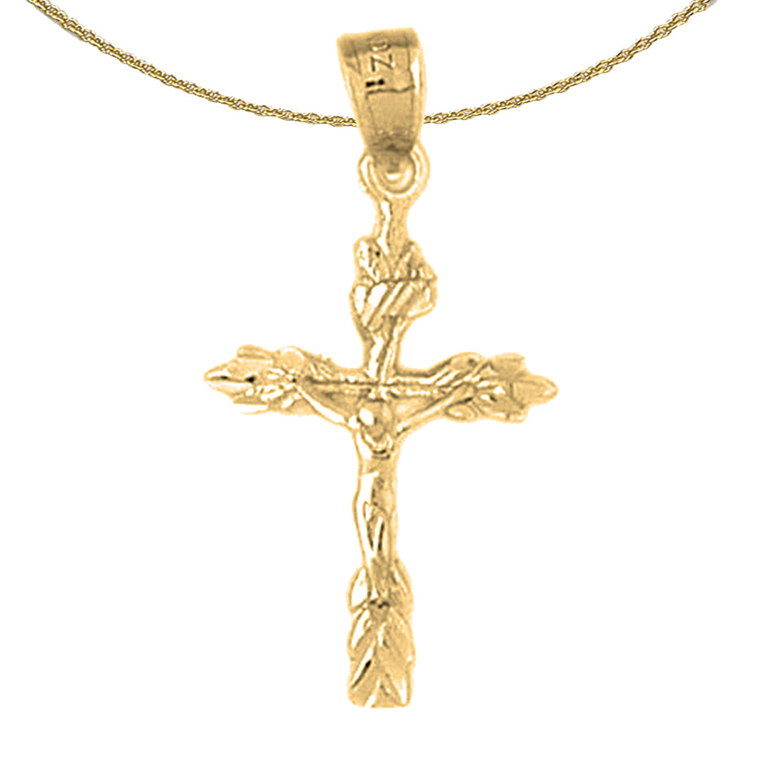 This is a beautiful 14K or 18K gold crucifix pendant. This 14K or 18K gold pendant measures 31 mm in length by 16 mm in width. Measurement includes bale. JewelsObsession creates all gold jewelry in our state of the art manufacturing facility.