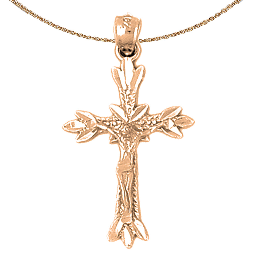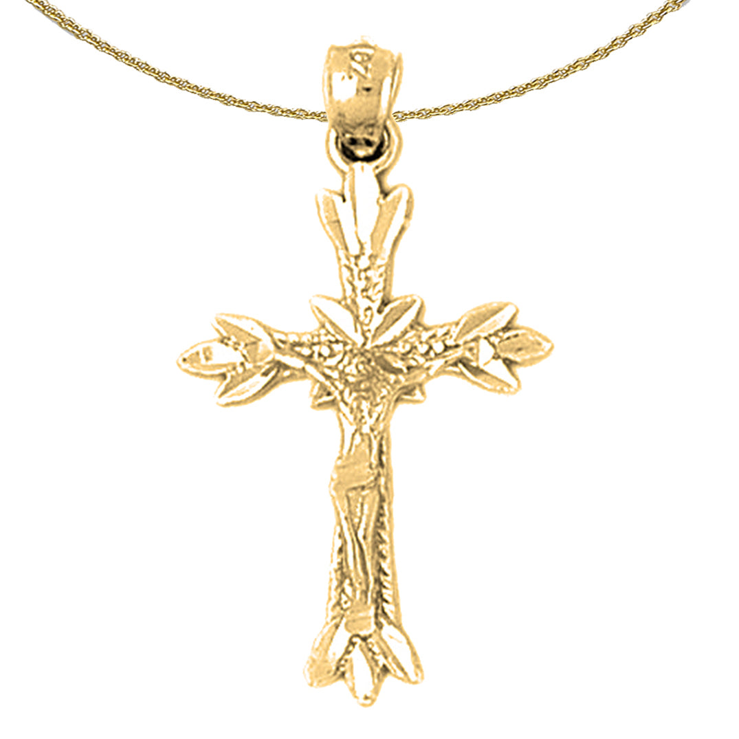 This is an elegant 14K or 18K gold crucifix pendant. This 14K or 18K gold pendant measures 34 mm in length by 19 mm in width. Measurement includes bale. JewelsObsession creates all gold jewelry in our state of the art manufacturing facility.