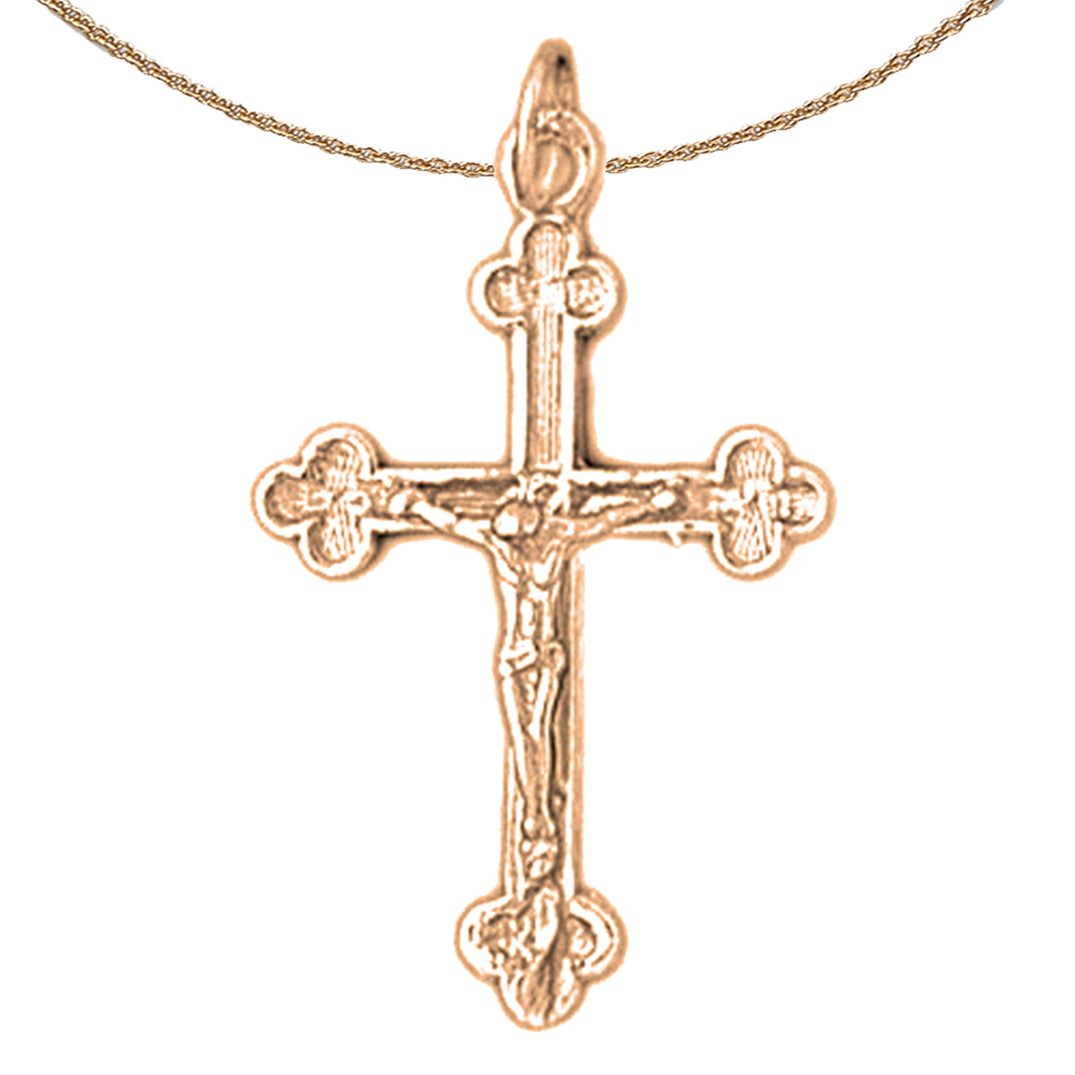 This is a beautiful 14K or 18K gold crucifix pendant. This 14K or 18K gold pendant measures 30 mm in length by 17 mm in width. Measurement includes bale. JewelsObsession creates all gold jewelry in our state of the art manufacturing facility.