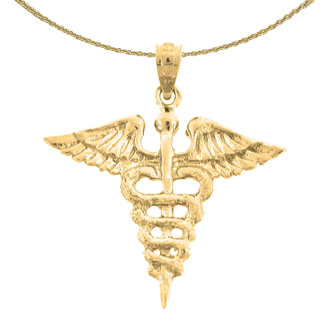 This is a beautiful 14K or 18K gold cadeusus pendant. This 14K or 18K gold pendant measures 28 mm in length by 25 mm in width. Measurement includes bale. JewelsObsession creates all gold jewelry in our state of the art manufacturing facility.