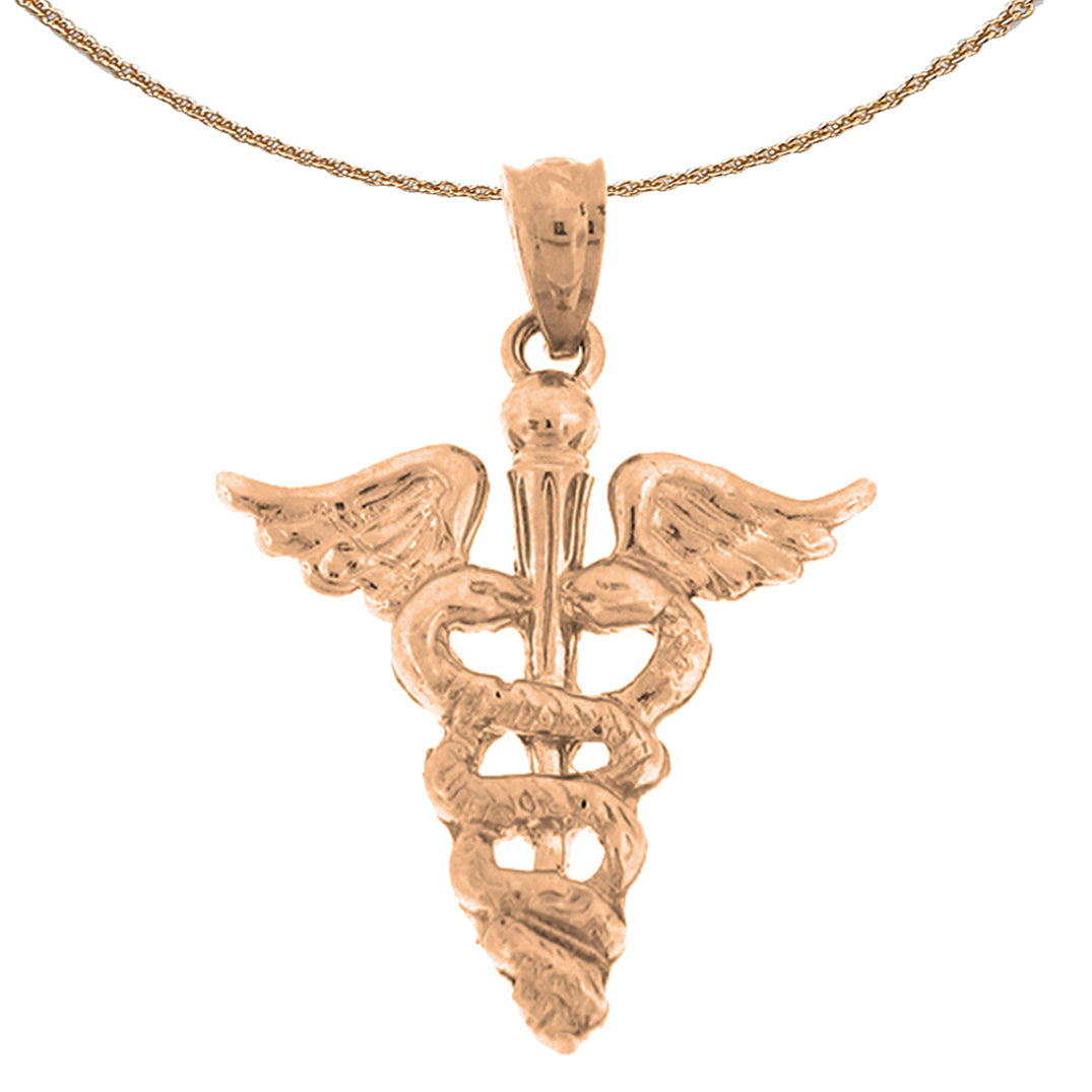 This is an elegant 14K or 18K gold cadeusus pendant. This 14K or 18K gold pendant measures 26 mm in length by 18 mm in width. Measurement includes bale. JewelsObsession creates all gold jewelry in our state of the art manufacturing facility.