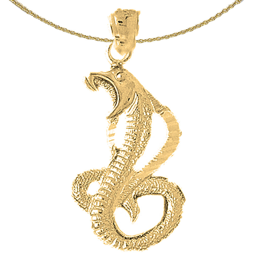 This is an elegant 10K, 14K or 18K gold cobra pendant. This 10K, 14K or 18K gold pendant measures 34 mm in length by 16 mm in width. Measurement includes bale. JewelsObsession creates all gold jewelry in our state of the art manufacturing facility.