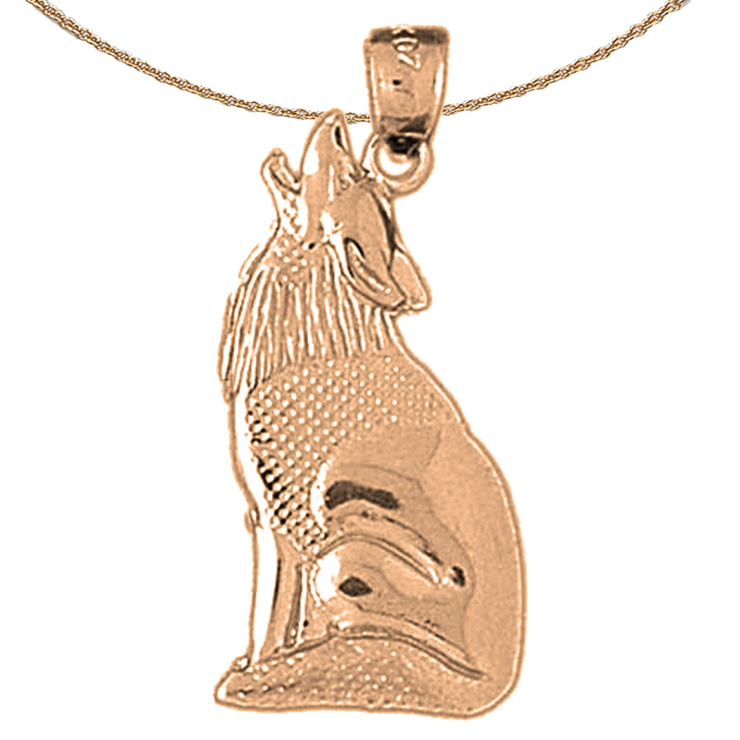 This is an elegant 10K, 14K or 18K gold coyote pendant. This 10K, 14K or 18K gold pendant measures 32 mm in length by 14 mm in width. Measurement includes bale. JewelsObsession creates all gold jewelry in our state of the art manufacturing facility.