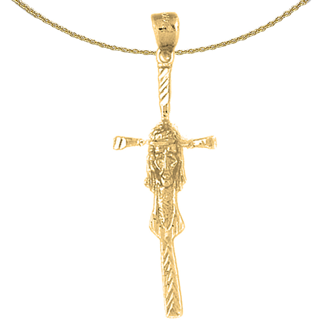 This is a stunning 10K, 14K or 18K gold crucifix pendant. This 10K, 14K or 18K gold pendant measures 44 mm in length by 15 mm in width. Measurement includes bale. JewelsObsession creates all gold jewelry in our state of the art manufacturing facility.