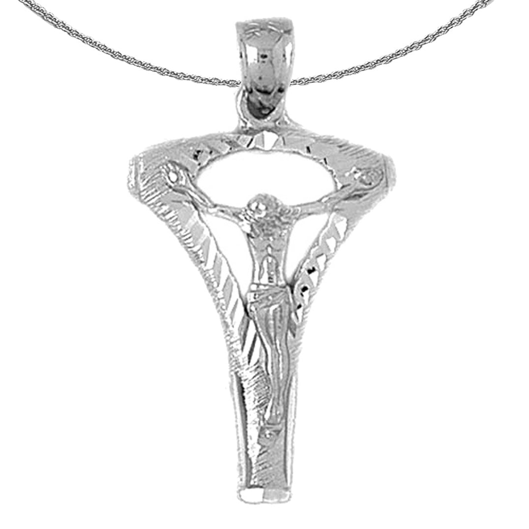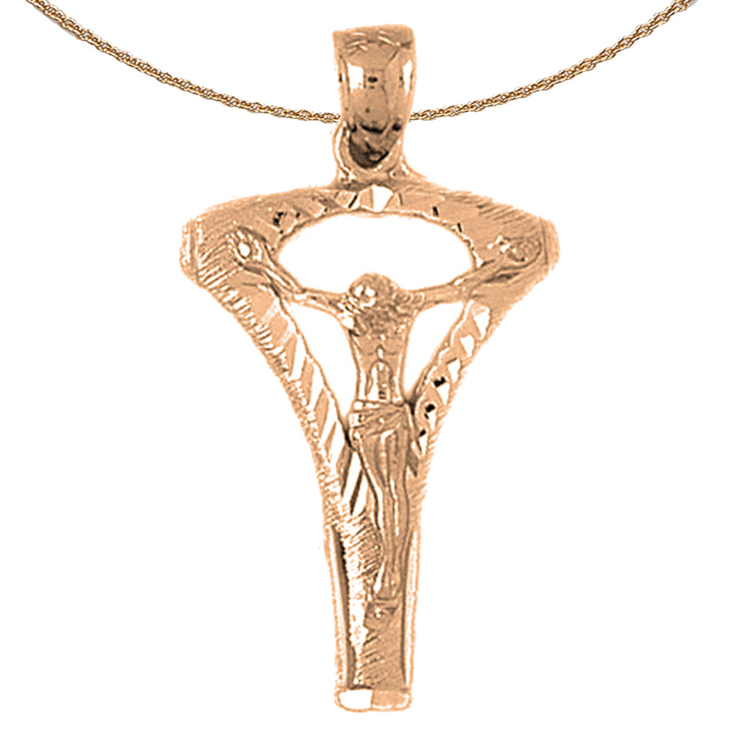 This gorgeous 10K, 14K or 18K gold crucifix pendant. This 10K, 14K or 18K gold pendant measures 39 mm in length by 22 mm in width. Measurement includes bale. JewelsObsession creates all gold jewelry in our state of the art manufacturing facility.