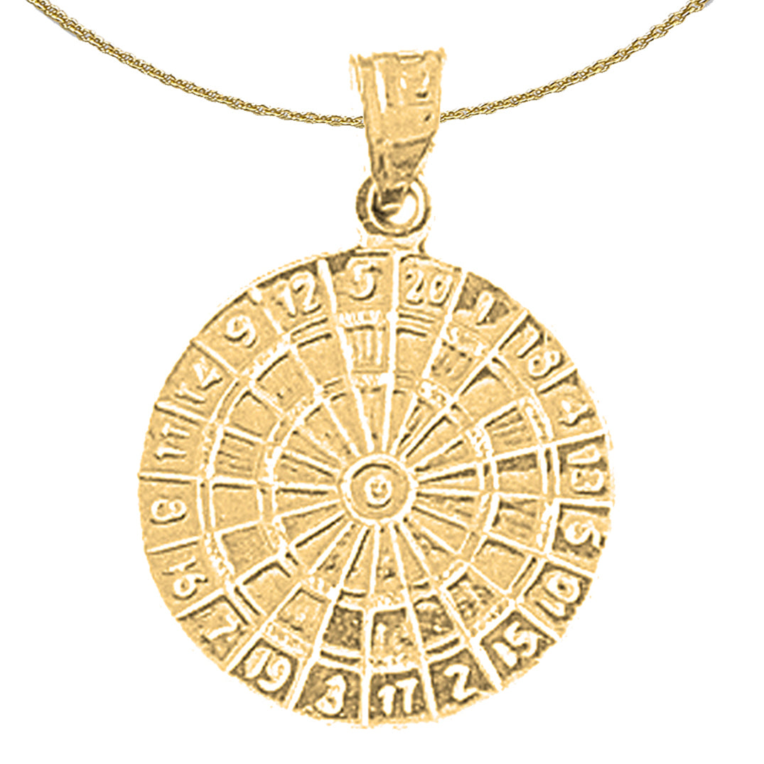 This is an elegant 14K or 18K gold dart board pendant. This 14K or 18K gold pendant measures 23 mm in length by 16 mm in width. Measurement includes bale. JewelsObsession creates all gold jewelry in our state of the art manufacturing facility.