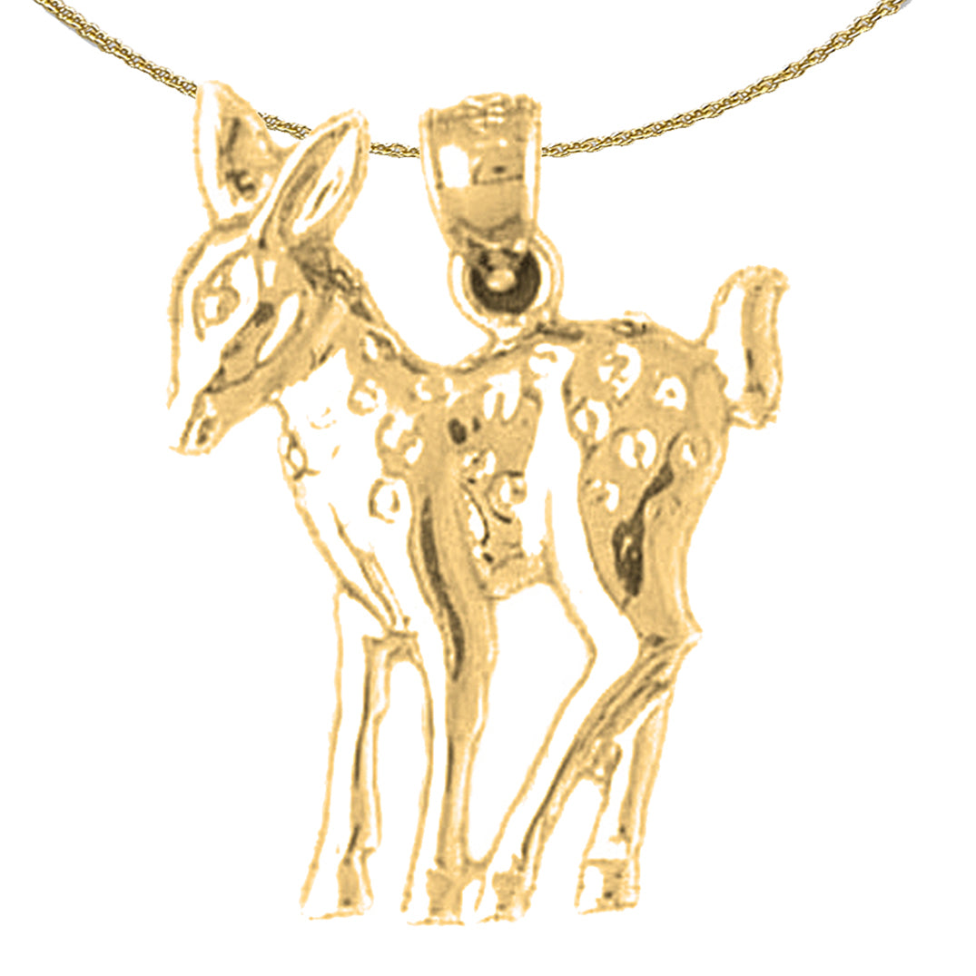 This gorgeous 10K, 14K or 18K gold deer pendant. This 10K, 14K or 18K gold pendant measures 25 mm in length by 19 mm in width. Measurement includes bale. JewelsObsession creates all gold jewelry in our state of the art manufacturing facility.