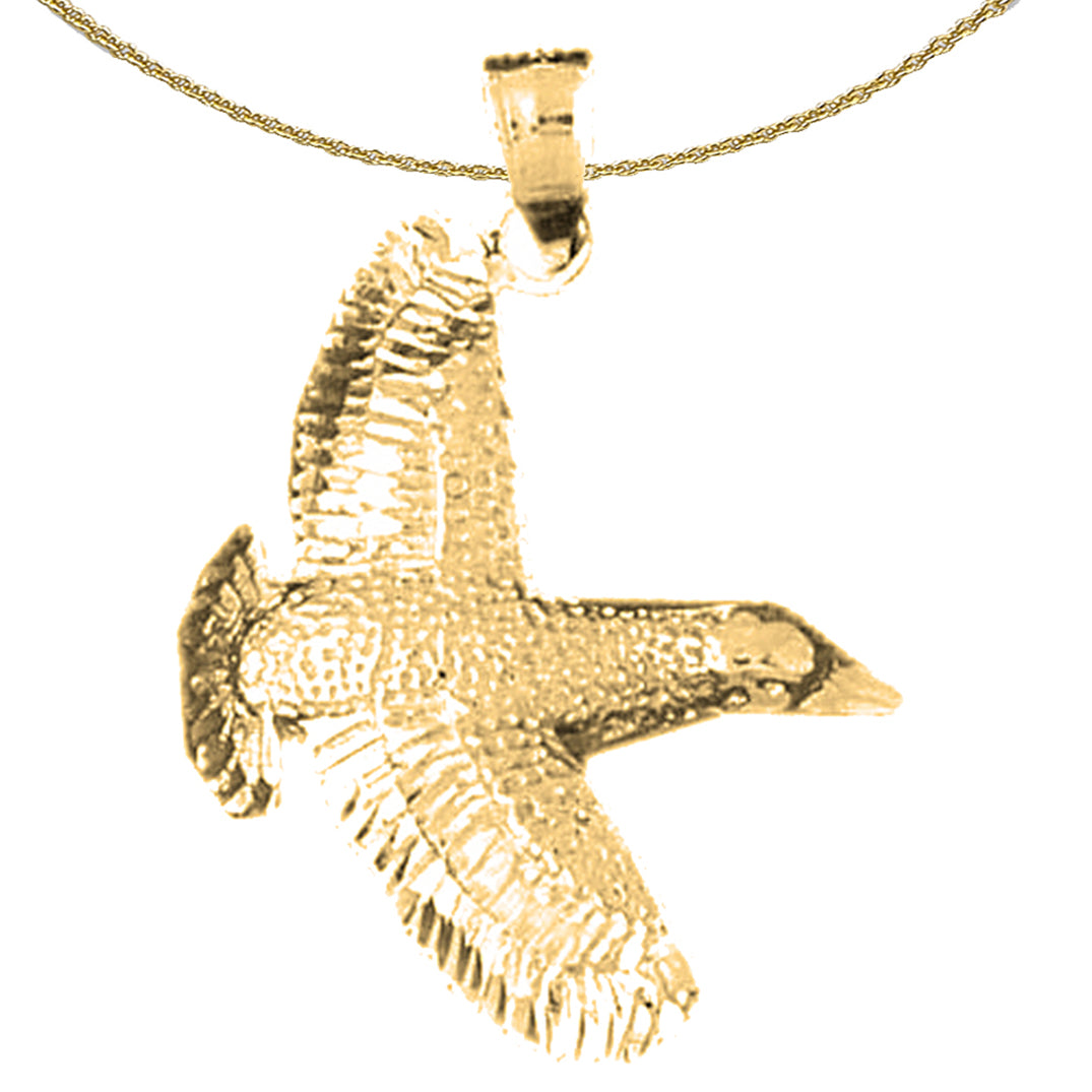 This is a beautiful 10K, 14K or 18K gold bird pendant. This 10K, 14K or 18K gold pendant measures 32 mm in length by 23 mm in width. Measurement includes bale. JewelsObsession creates all gold jewelry in our state of the art manufacturing facility.