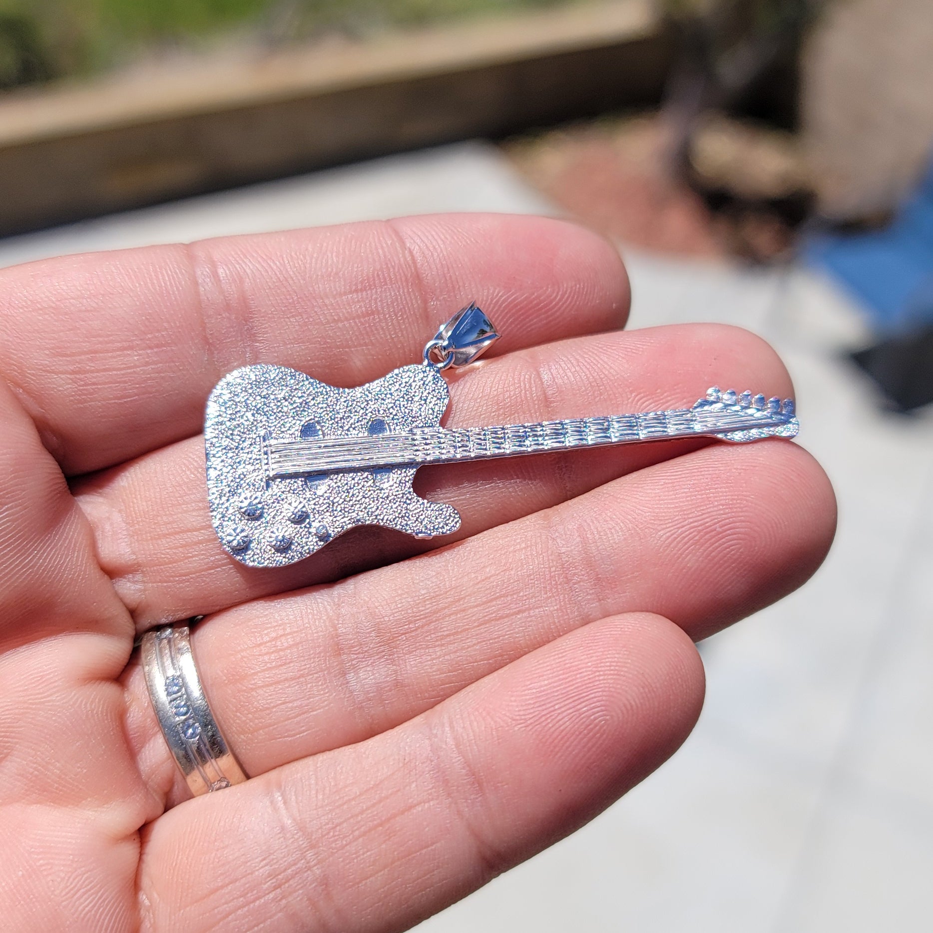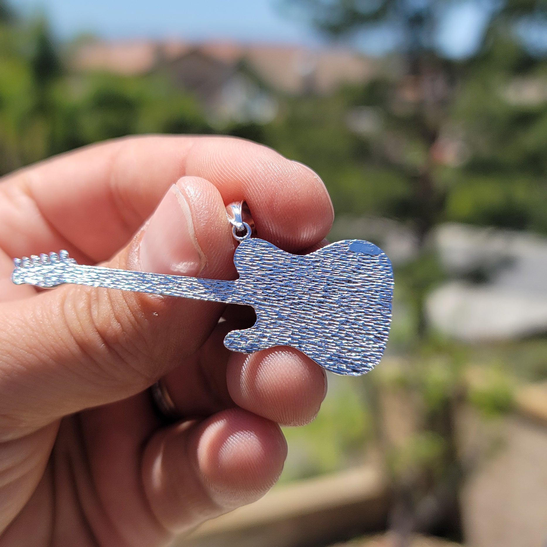 This is a beautiful 10K, 14K or 18K gold electric guitar pendant. This 10K, 14K or 18K gold pendant measures 51 mm in length by 42 mm in width. Measurement includes bale. JewelsObsession creates all gold jewelry in our state of the art manufacturing facility.