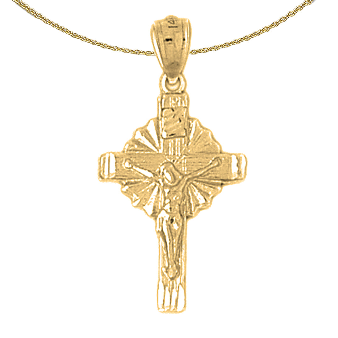 This is an elegant 10K, 14K or 18K gold crucifix pendant. This 10K, 14K or 18K gold pendant measures 31 mm in length by 16 mm in width. Measurement includes bale. JewelsObsession creates all gold jewelry in our state of the art manufacturing facility.