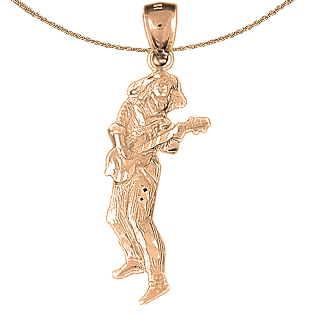 This is an elegant 10K, 14K or 18K gold guitarist pendant. This 10K, 14K or 18K gold pendant measures 41 mm in length by 15 mm in width. Measurement includes bale. JewelsObsession creates all gold jewelry in our state of the art manufacturing facility.
