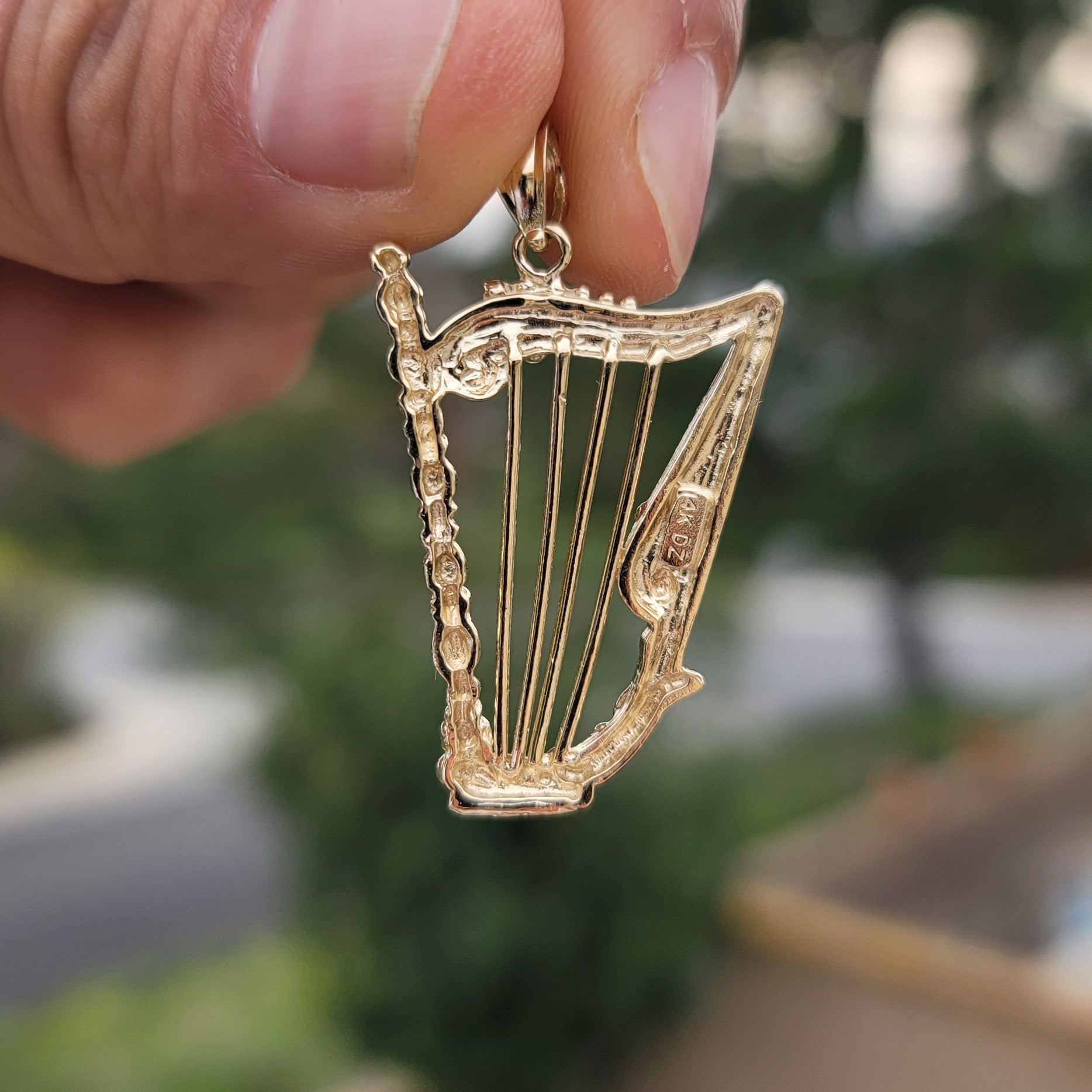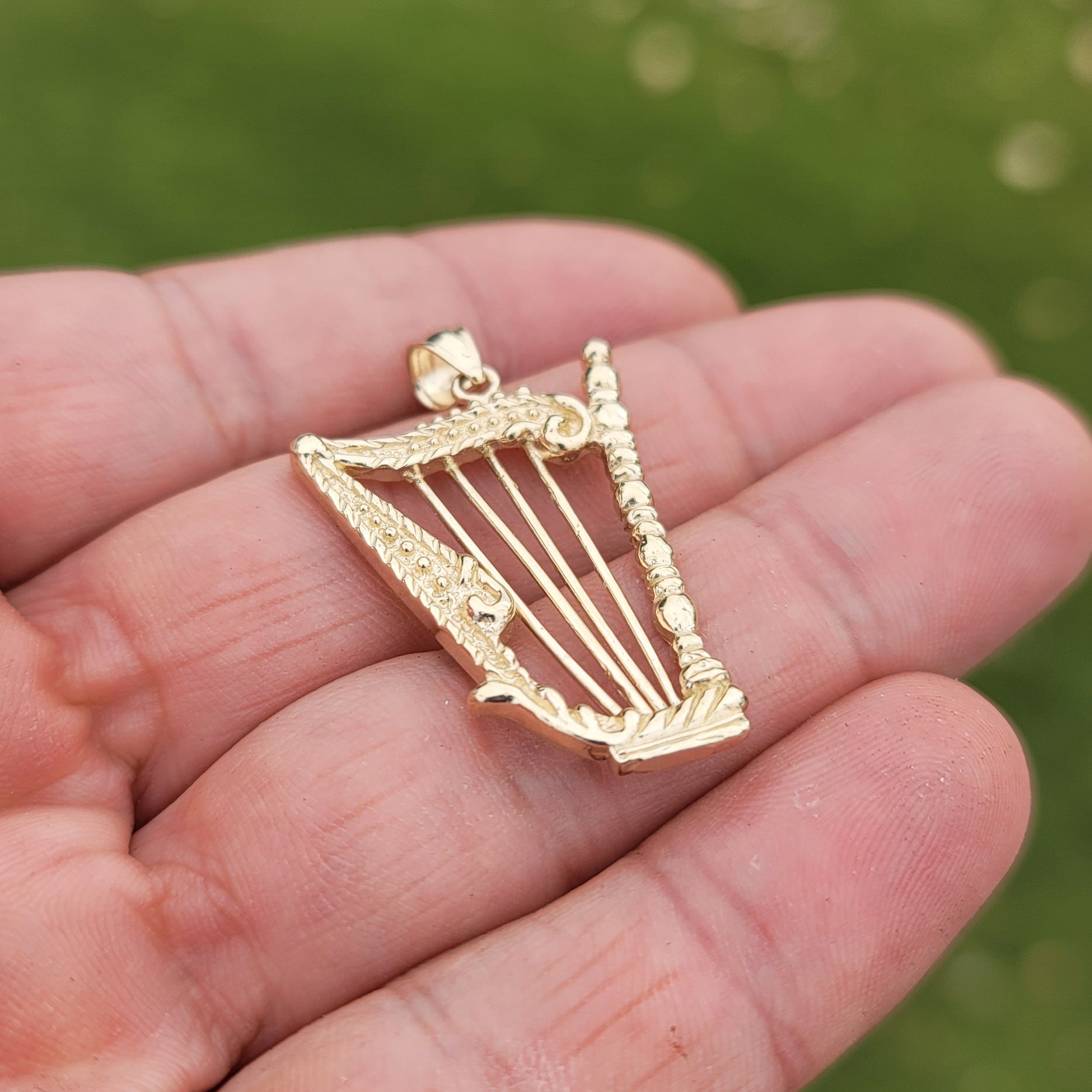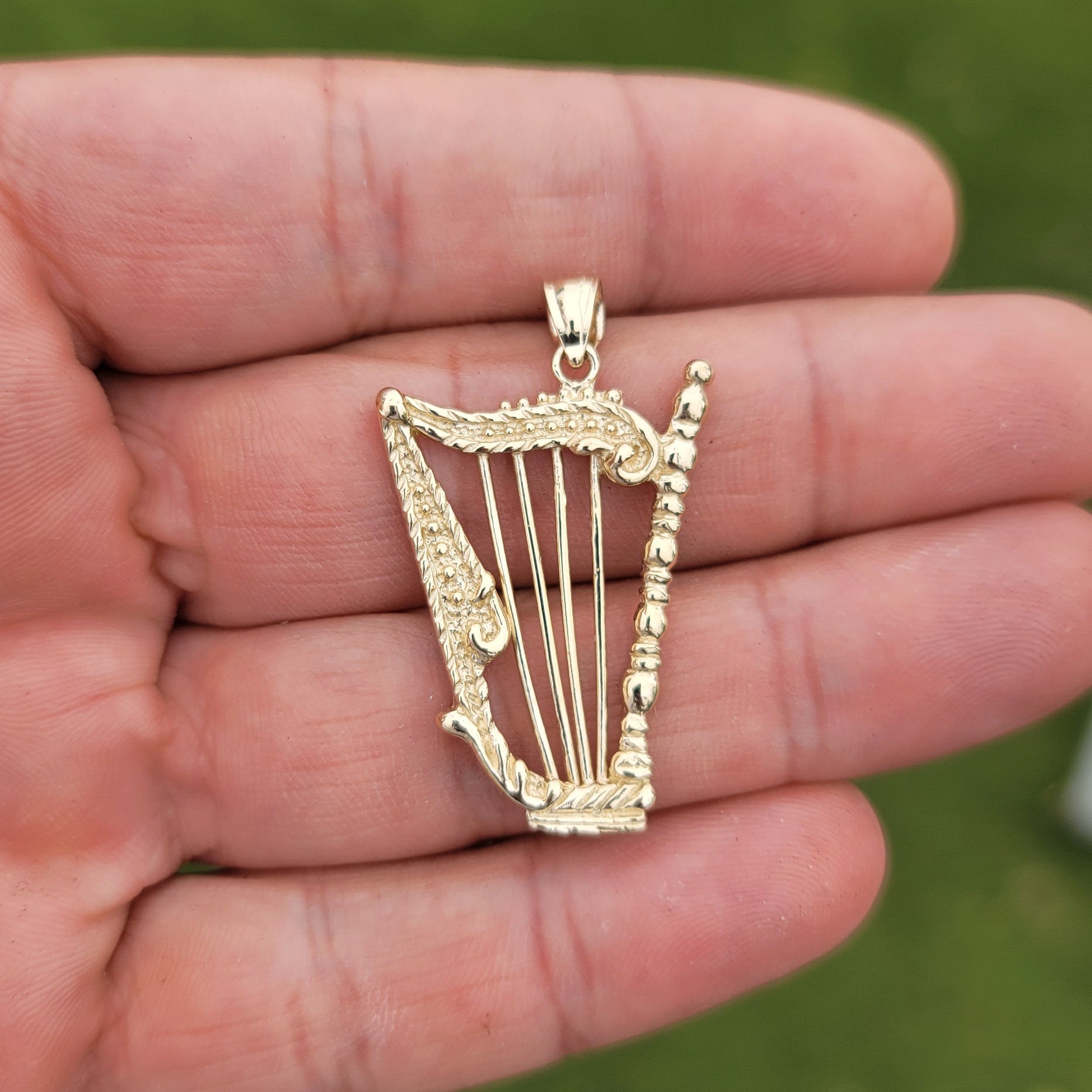 This gorgeous 10K, 14K or 18K gold harp pendant. This 10K, 14K or 18K gold pendant measures 42 mm in length by 24 mm in width. Measurement includes bale. JewelsObsession creates all gold jewelry in our state of the art manufacturing facility.