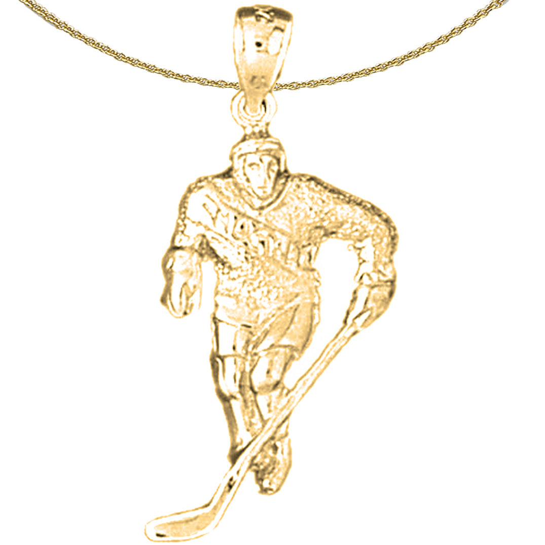This is a beautiful 14K or 18K gold hockey player pendant. This 14K or 18K gold pendant measures 33 mm in length by 15 mm in width. Measurement includes bale. JewelsObsession creates all gold jewelry in our state of the art manufacturing facility.