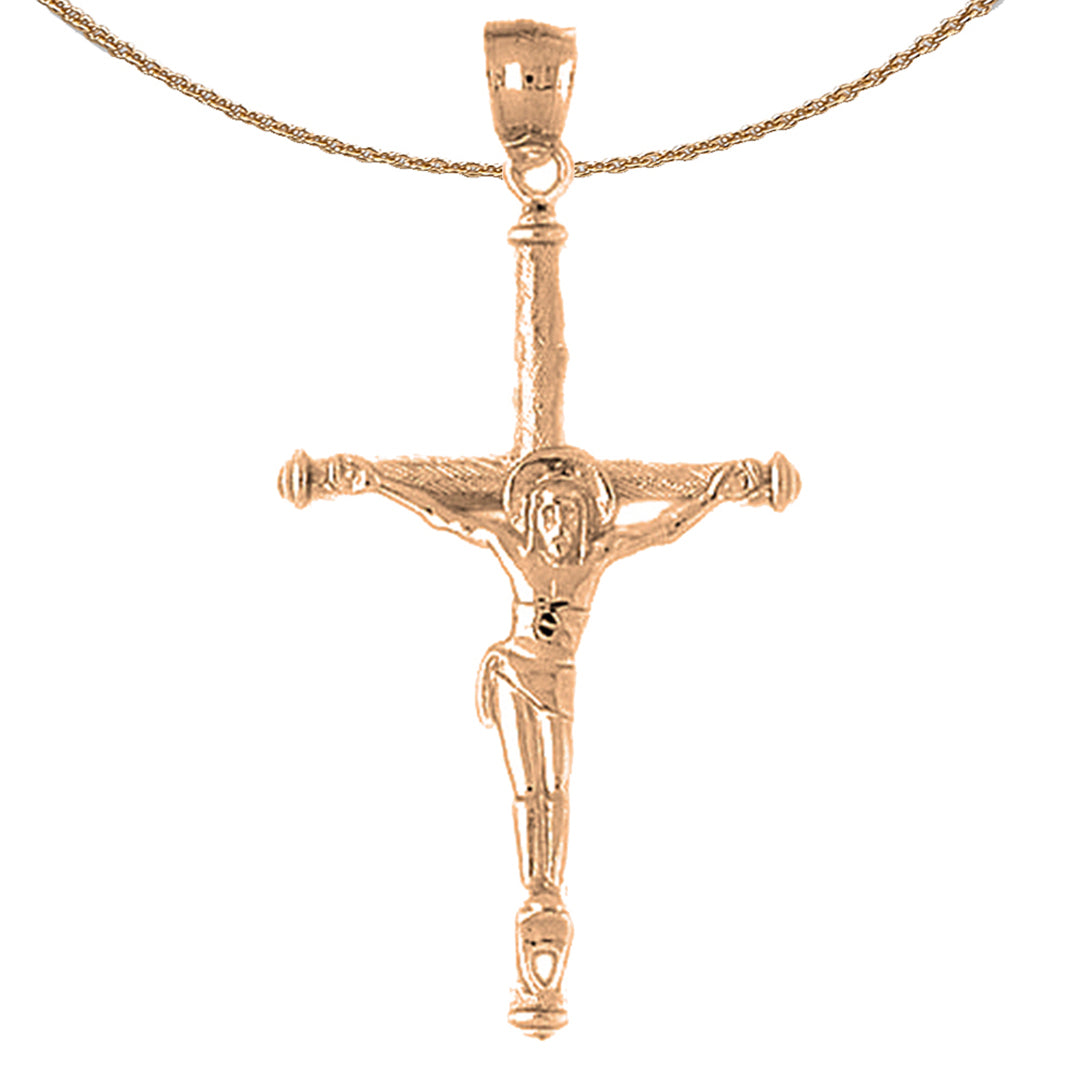 This is a stunning 10K, 14K or 18K gold crucifix pendant. This 10K, 14K or 18K gold pendant measures 55 mm in length by 29 mm in width. Measurement includes bale. JewelsObsession creates all gold jewelry in our state of the art manufacturing facility.