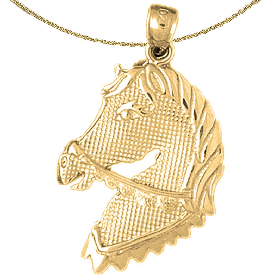 This gorgeous 10K, 14K or 18K gold horse head pendant. This 10K, 14K or 18K gold pendant measures 32 mm in length by 20 mm in width. Measurement includes bale. JewelsObsession creates all gold jewelry in our state of the art manufacturing facility.