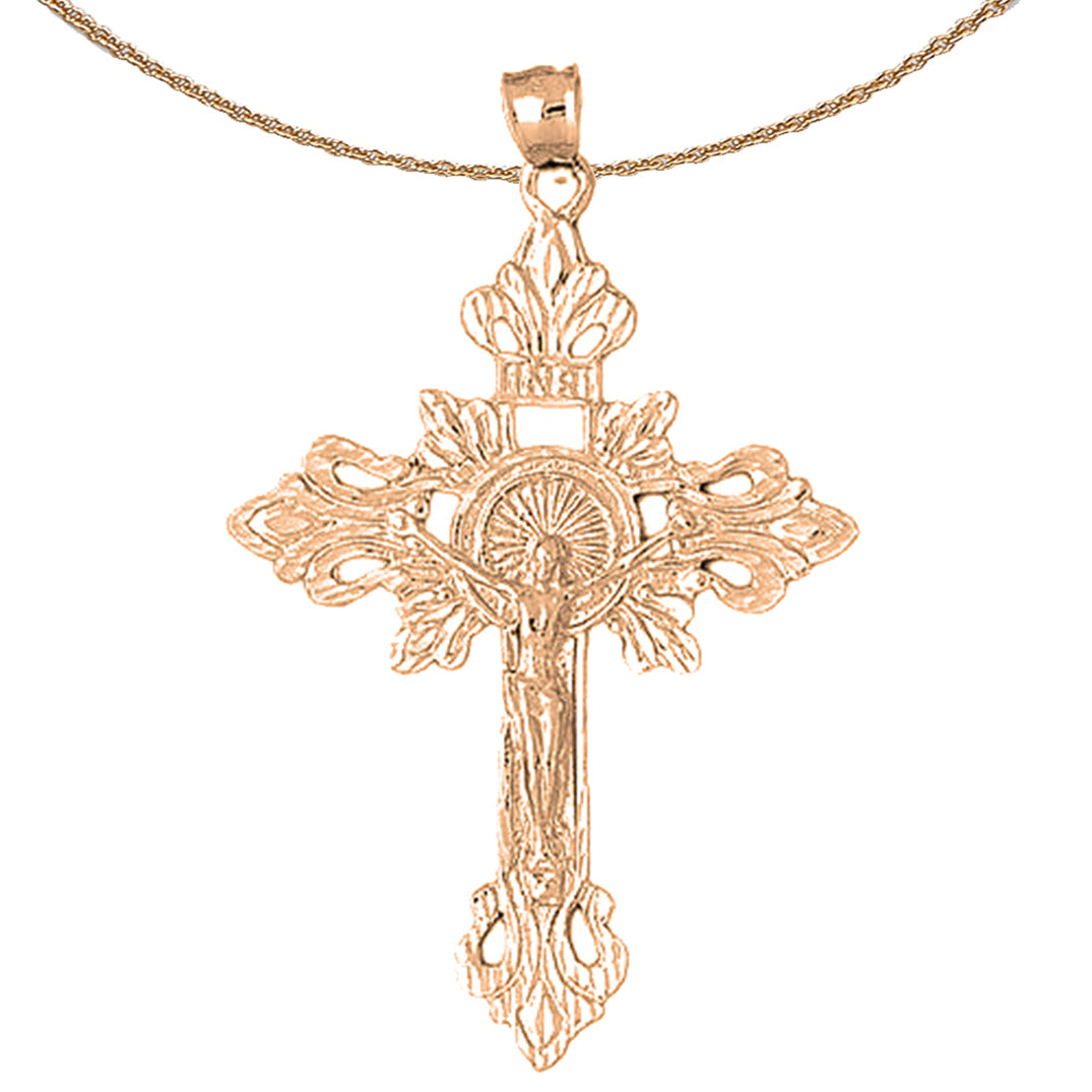 This is a stunning 10K, 14K or 18K gold crucifix pendant. This 10K, 14K or 18K gold pendant measures 58 mm in length by 48 mm in width. Measurement includes bale. JewelsObsession creates all gold jewelry in our state of the art manufacturing facility.