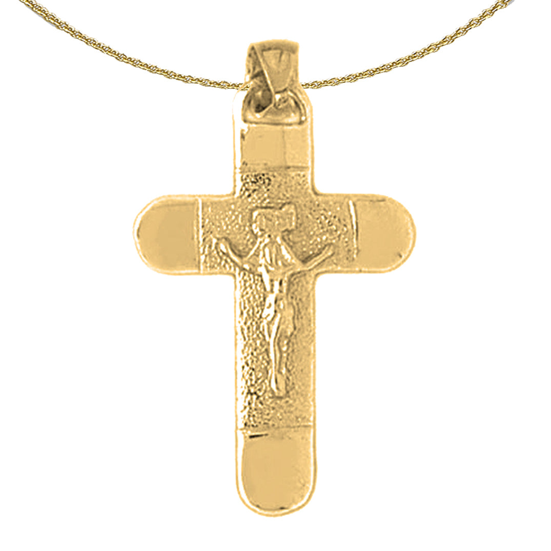 This is an elegant 14K or 18K gold crucifix pendant. This 14K or 18K gold pendant measures 32 mm in length by 20 mm in width. Measurement includes bale. JewelsObsession creates all gold jewelry in our state of the art manufacturing facility.