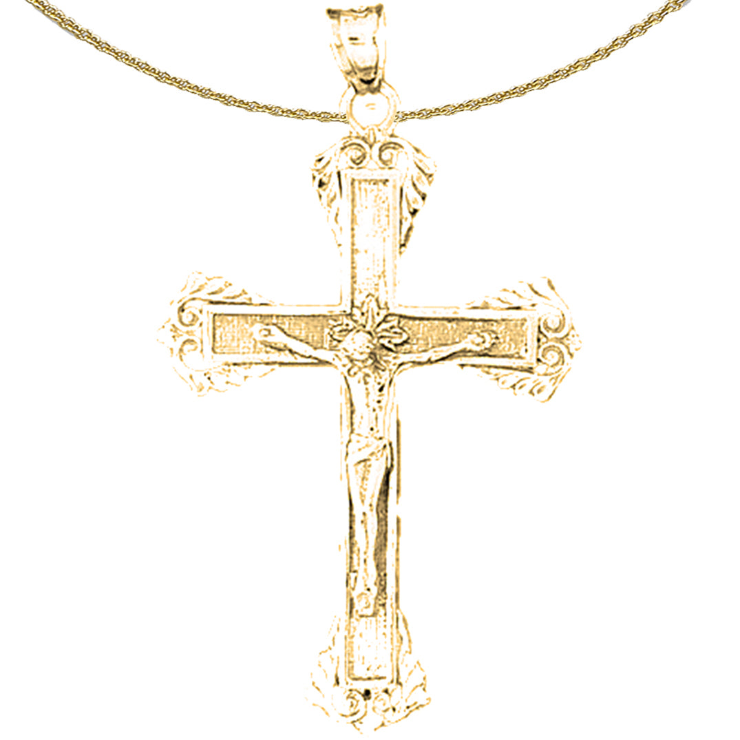 This is an elegant 14K or 18K gold cross pendant. This 14K or 18K gold pendant measures 56 mm in length by 33 mm in width. Measurement includes bale. JewelsObsession creates all gold jewelry in our state of the art manufacturing facility.