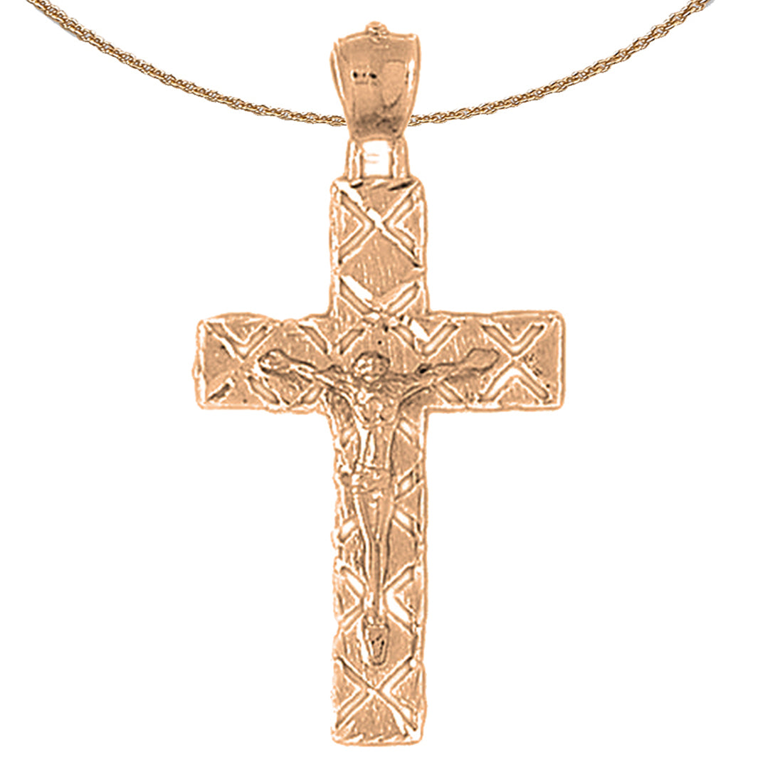 This is a stunning 10K, 14K or 18K gold crucifix pendant. This 10K, 14K or 18K gold pendant measures 45 mm in length by 23 mm in width. Measurement includes bale. JewelsObsession creates all gold jewelry in our state of the art manufacturing facility.