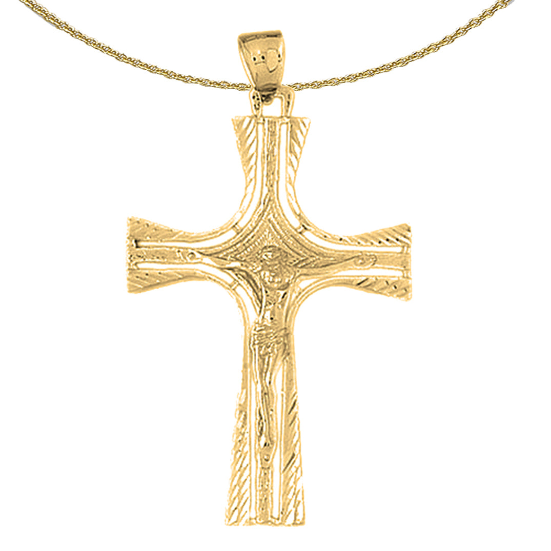 This is a stunning 10K, 14K or 18K gold crucifix pendant. This 10K, 14K or 18K gold pendant measures 59 mm in length by 34 mm in width. Measurement includes bale. JewelsObsession creates all gold jewelry in our state of the art manufacturing facility.