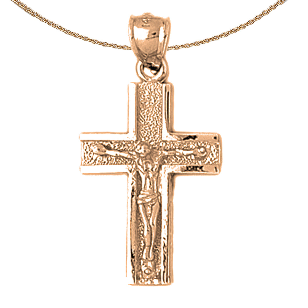This is an elegant 10K, 14K or 18K gold crucifix pendant. This 10K, 14K or 18K gold pendant measures 33 mm in length by 17 mm in width. Measurement includes bale. JewelsObsession creates all gold jewelry in our state of the art manufacturing facility.