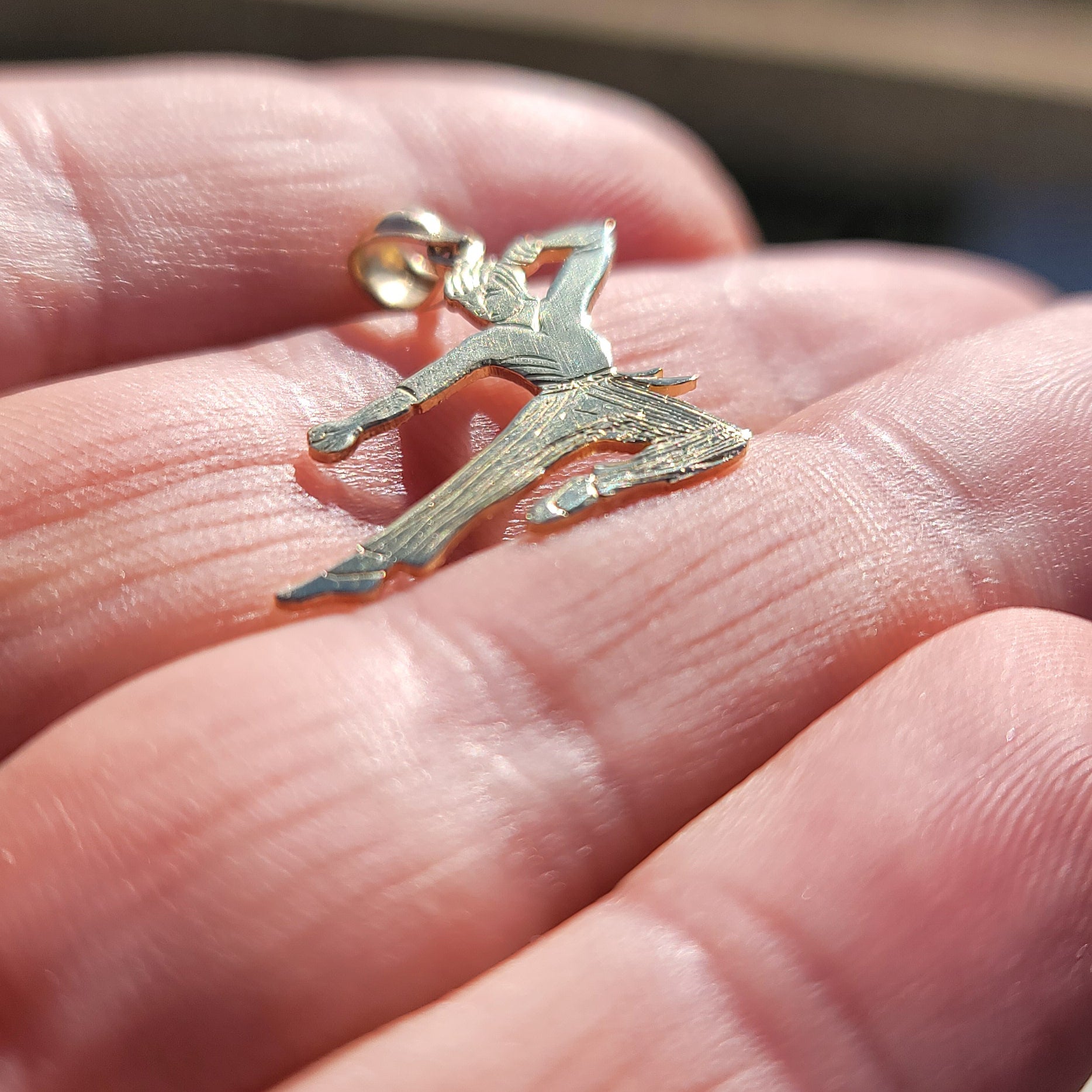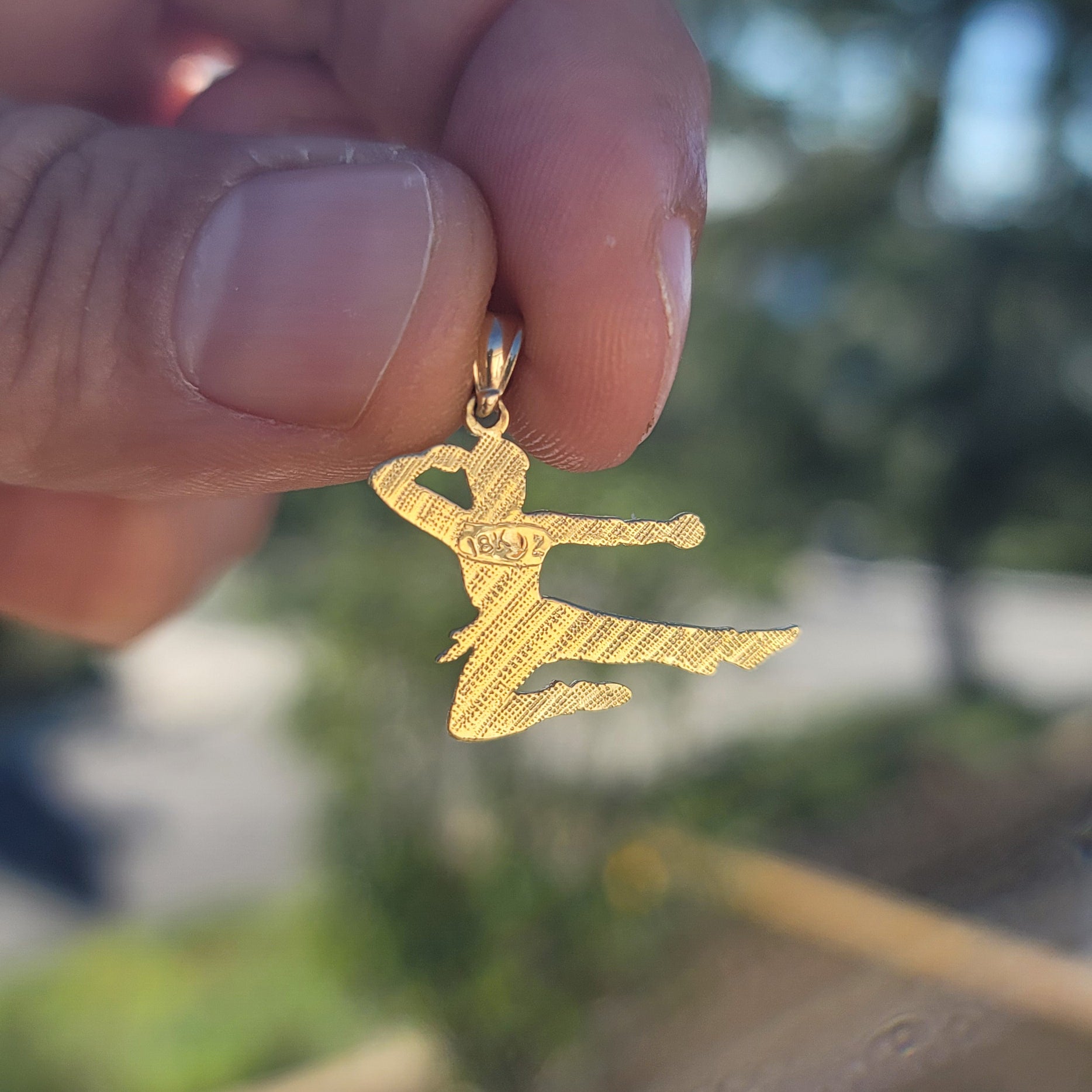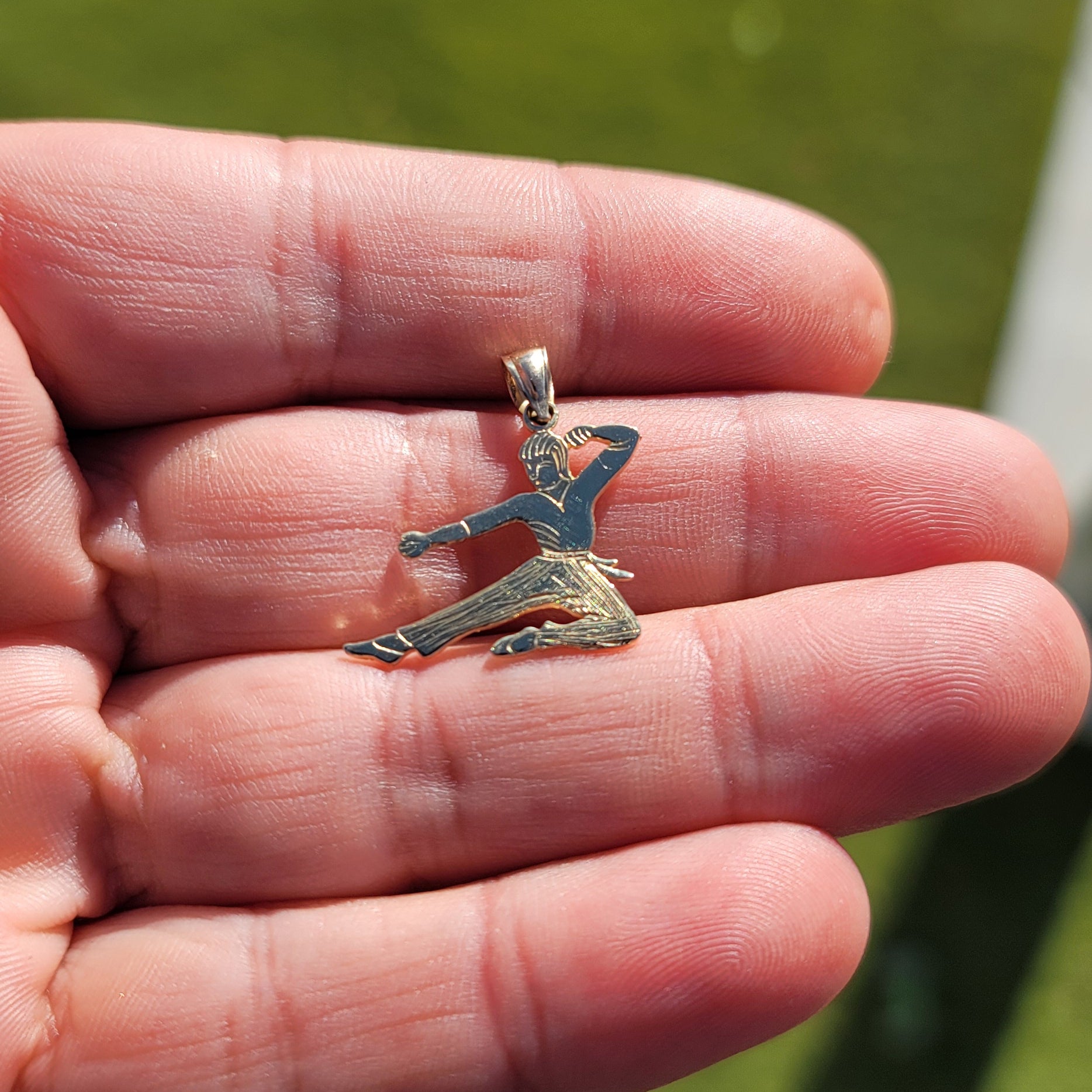 This is a stunning 14K or 18K gold martial arts karate pendant. This 14K or 18K gold pendant measures 25 mm in length by 21 mm in width. Measurement includes bale. JewelsObsession creates all gold jewelry in our state of the art manufacturing facility.
