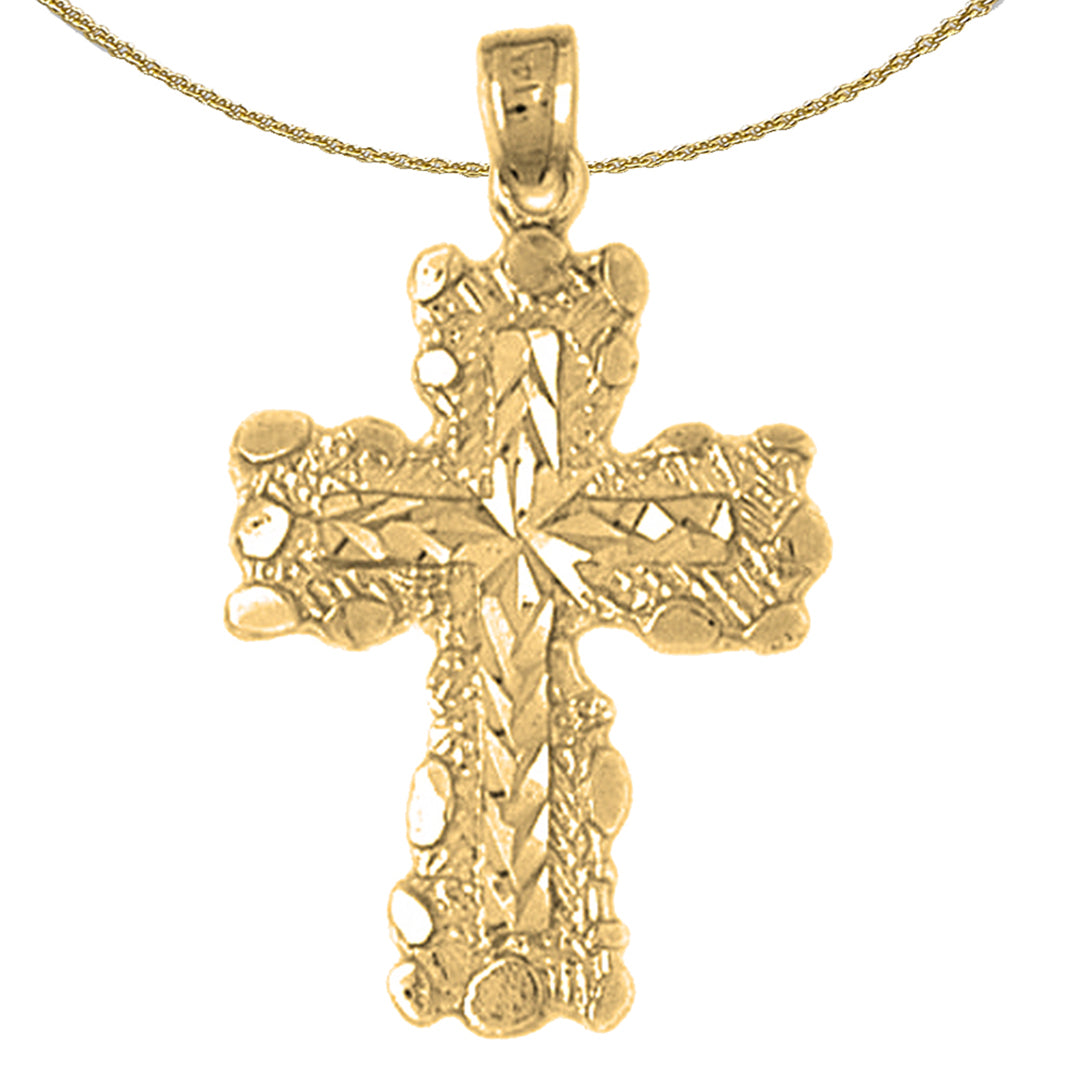 This is an elegant 10K, 14K or 18K gold cross pendant. This 10K, 14K or 18K gold pendant measures 34 mm in length by 20 mm in width. Measurement includes bale. JewelsObsession creates all gold jewelry in our state of the art manufacturing facility.