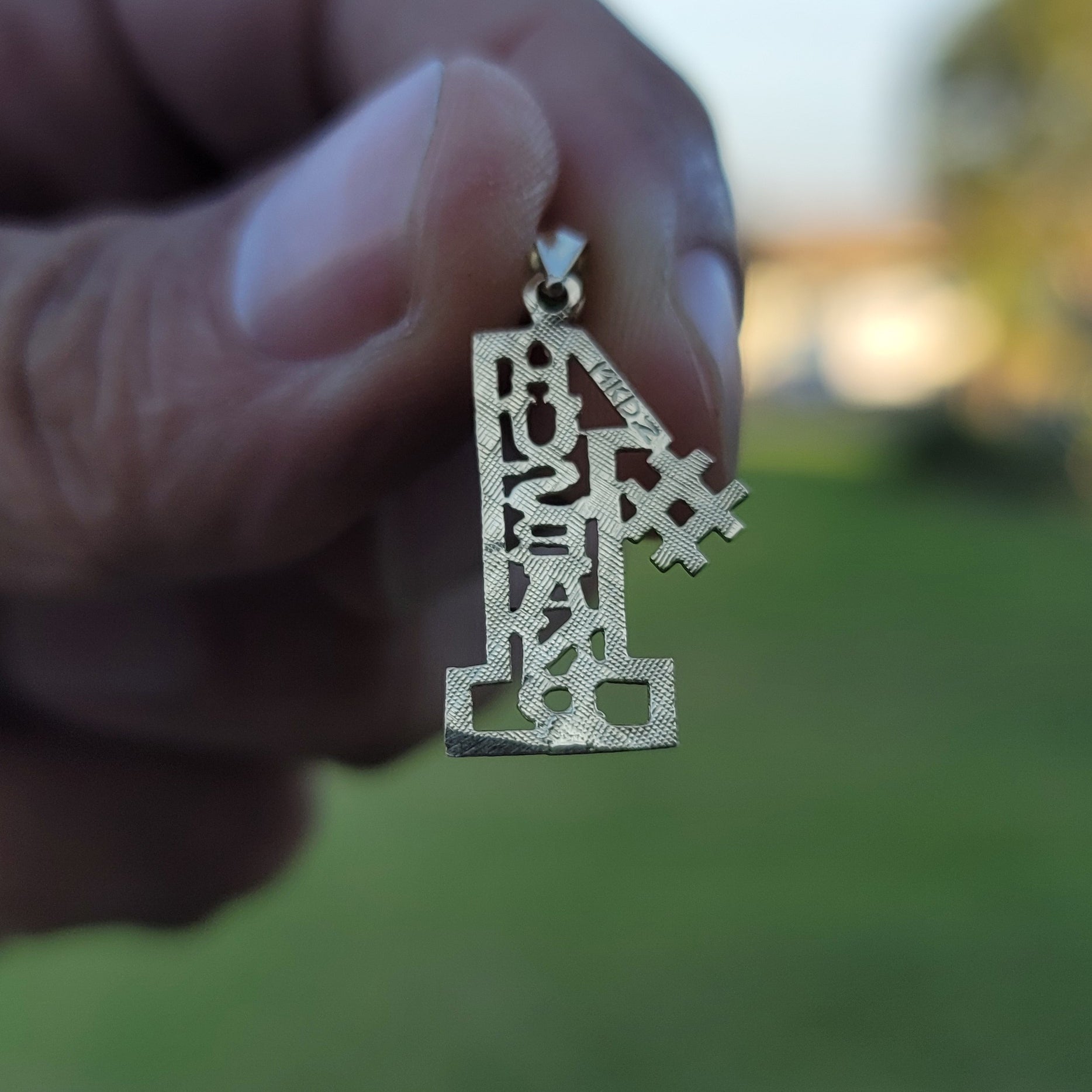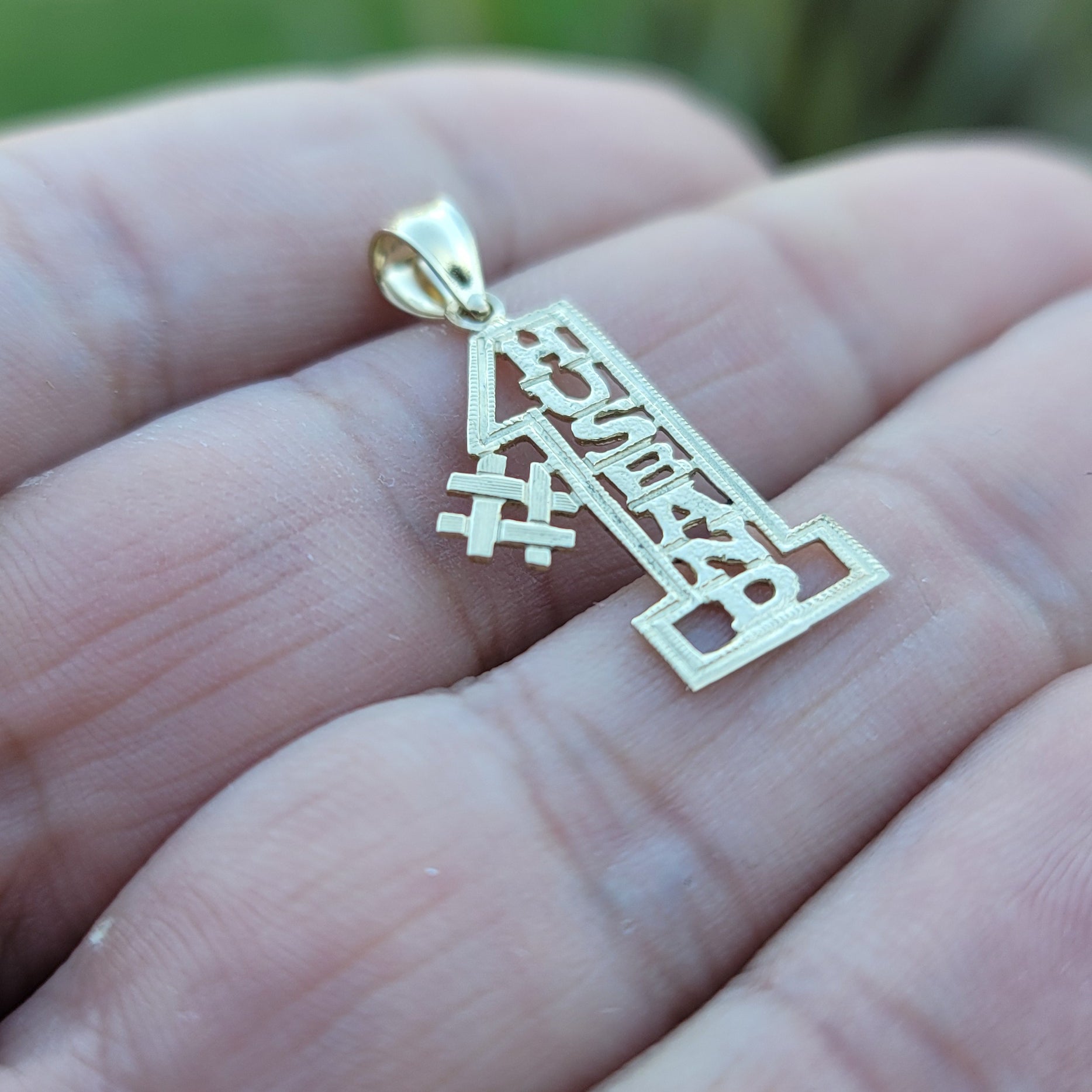 This gorgeous 14K or 18K gold #1 husband pendant. This 14K or 18K gold pendant measures in length by in width. Measurement includes bale. JewelsObsession creates all gold jewelry in our state of the art manufacturing facility.