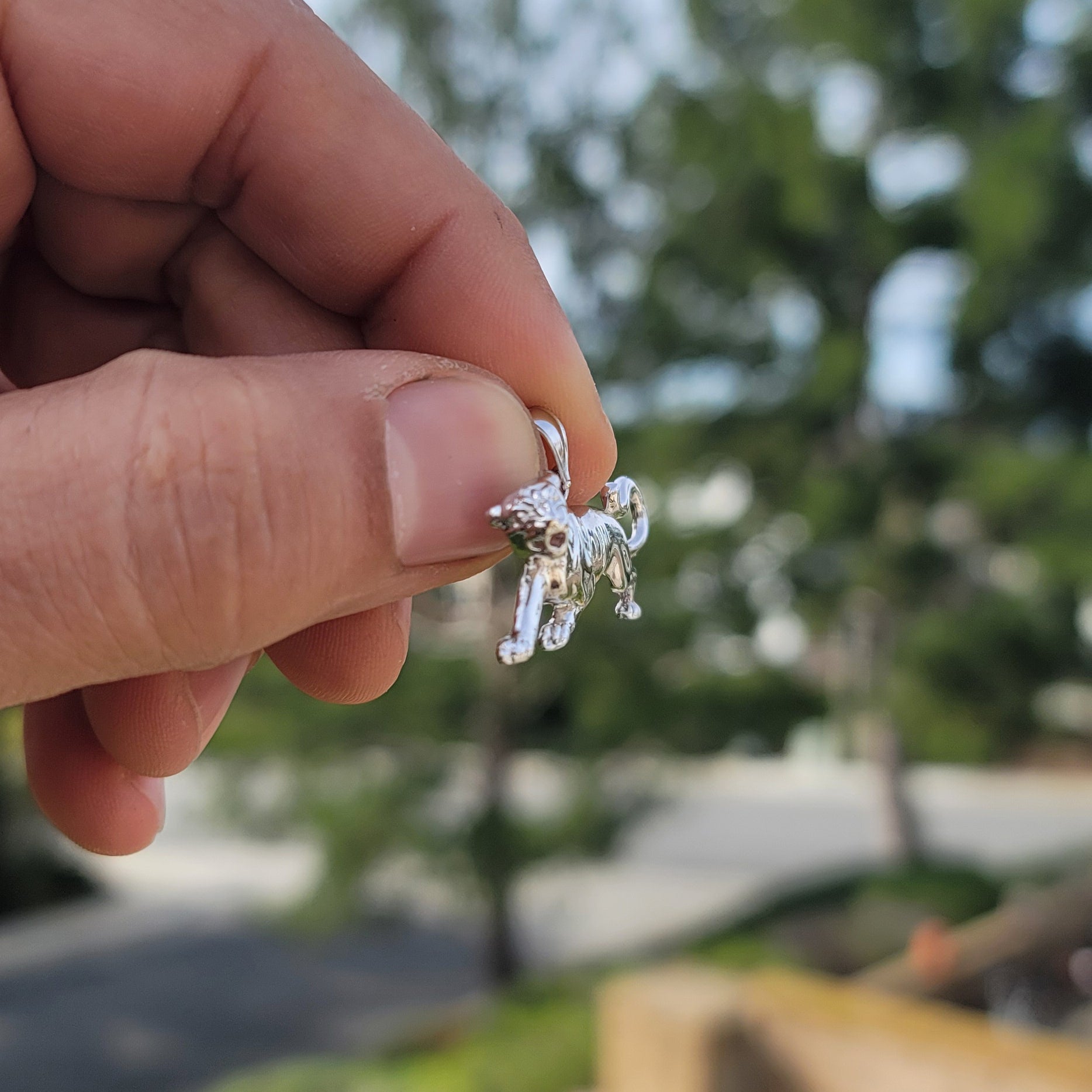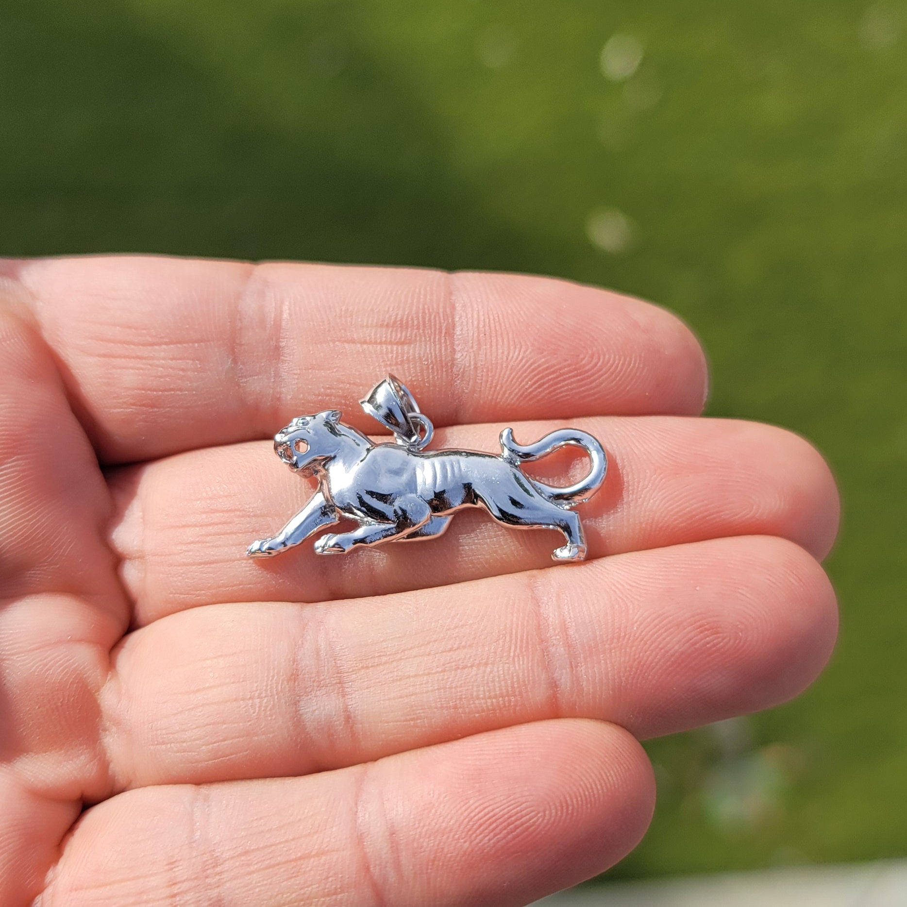 This gorgeous 10K, 14K or 18K gold panther pendant. This 10K, 14K or 18K gold pendant measures 22 mm in length by 39 mm in width. Measurement includes bale. JewelsObsession creates all gold jewelry in our state of the art manufacturing facility.