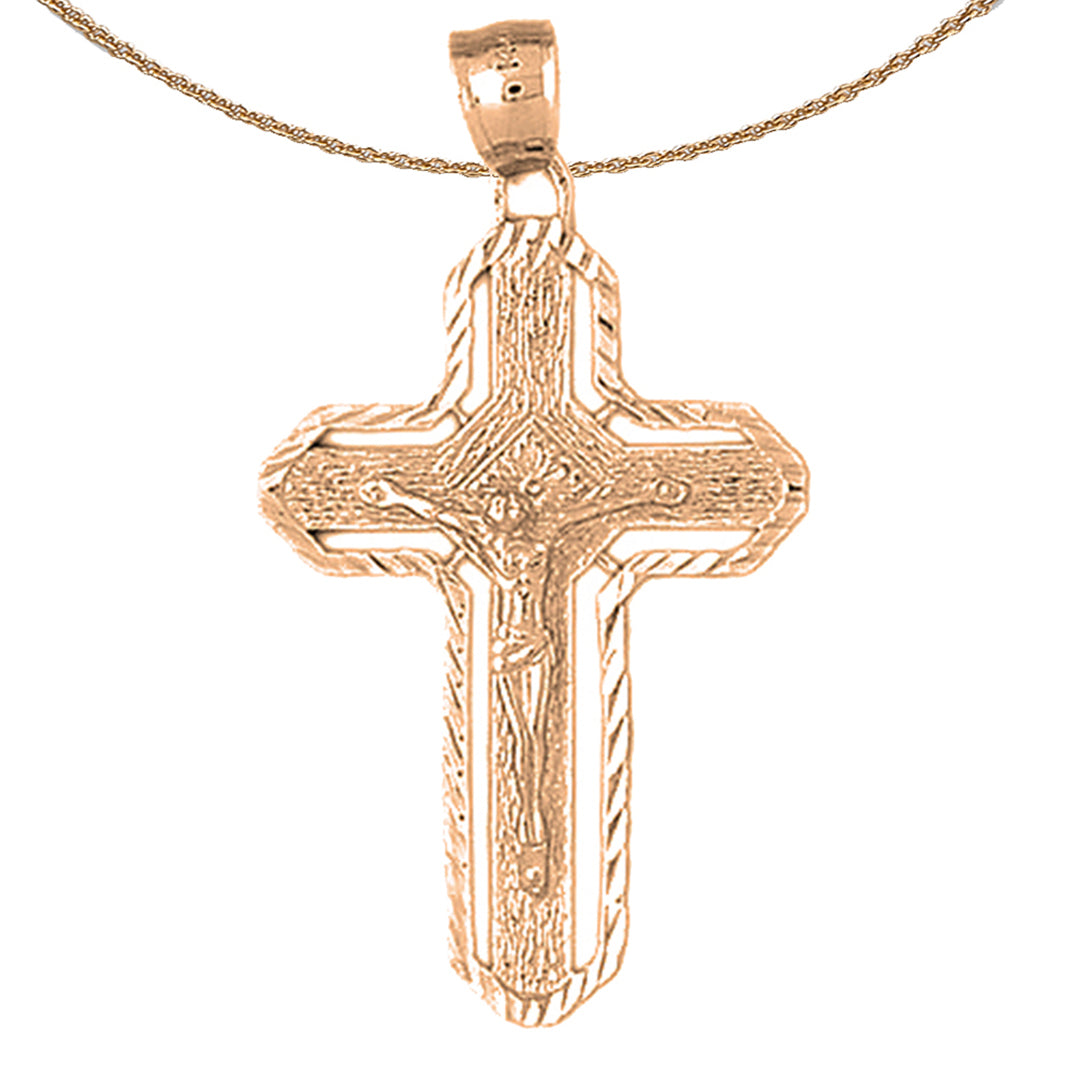 This gorgeous 10K, 14K or 18K gold crucifix pendant. This 10K, 14K or 18K gold pendant measures 48 mm in length by 27 mm in width. Measurement includes bale. JewelsObsession creates all gold jewelry in our state of the art manufacturing facility.