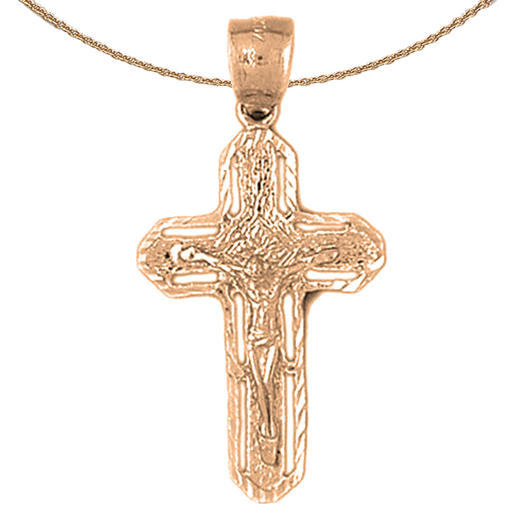 This is an elegant 10K, 14K or 18K gold crucifix pendant. This 10K, 14K or 18K gold pendant measures 38 mm in length by 20 mm in width. Measurement includes bale. JewelsObsession creates all gold jewelry in our state of the art manufacturing facility.