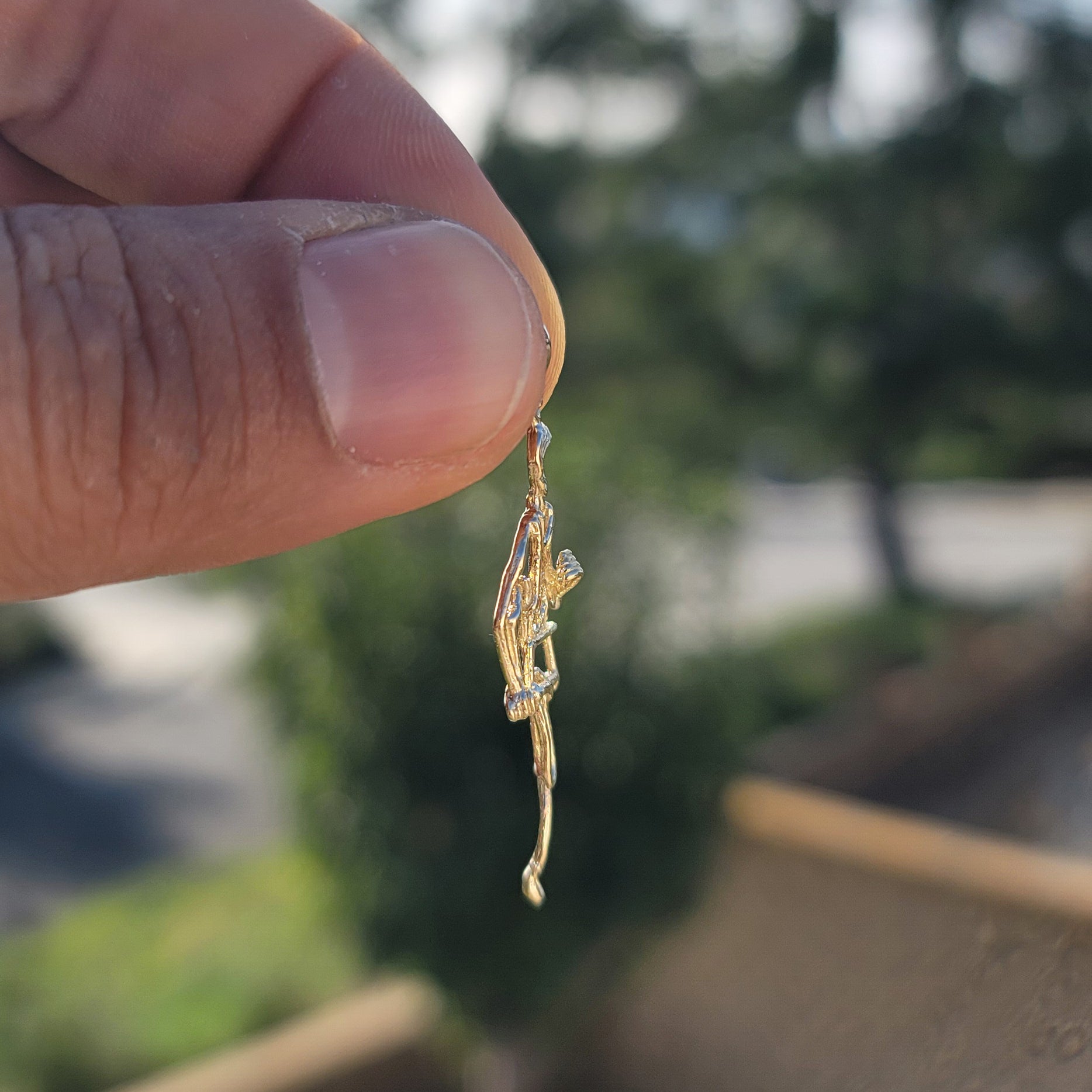 This is a beautiful 14K or 18K gold runner pendant. This 14K or 18K gold pendant measures 42 mm in length by 12 mm in width. Measurement includes bale. JewelsObsession creates all gold jewelry in our state of the art manufacturing facility.
