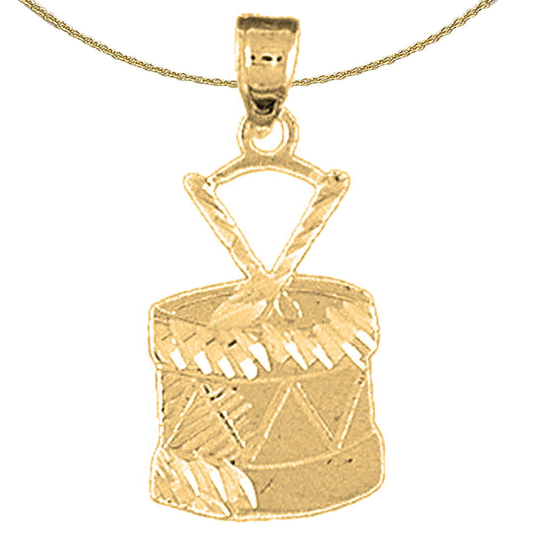 This gorgeous 14K or 18K gold snare drum pendant. This 14K or 18K gold pendant measures 25 mm in length by 12 mm in width. Measurement includes bale. JewelsObsession creates all gold jewelry in our state of the art manufacturing facility.