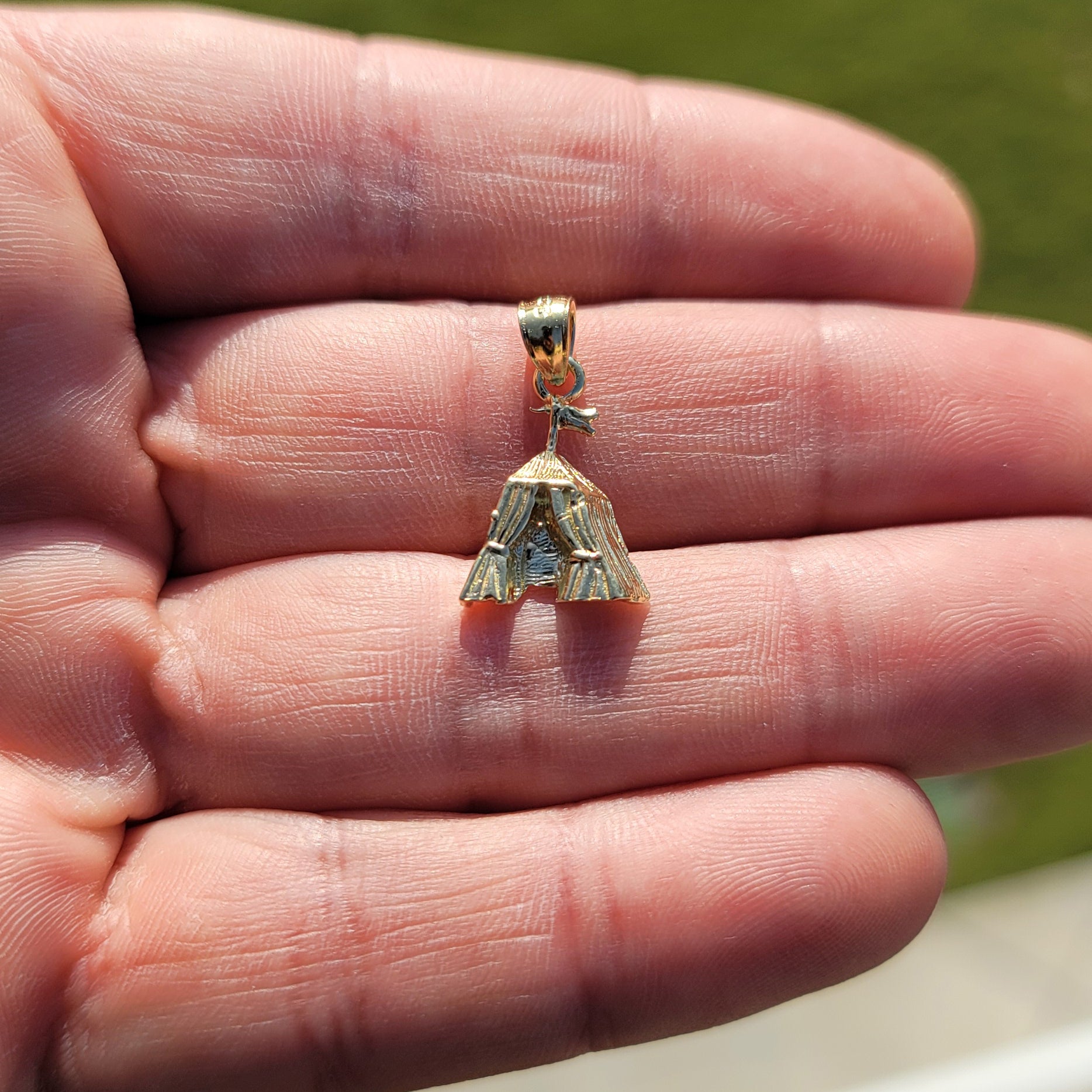 This is a beautiful 14K or 18K gold tent/cabin pendant. This 14K or 18K gold pendant measures 22 mm in length by 13 mm in width. Measurement includes bale. JewelsObsession creates all gold jewelry in our state of the art manufacturing facility.