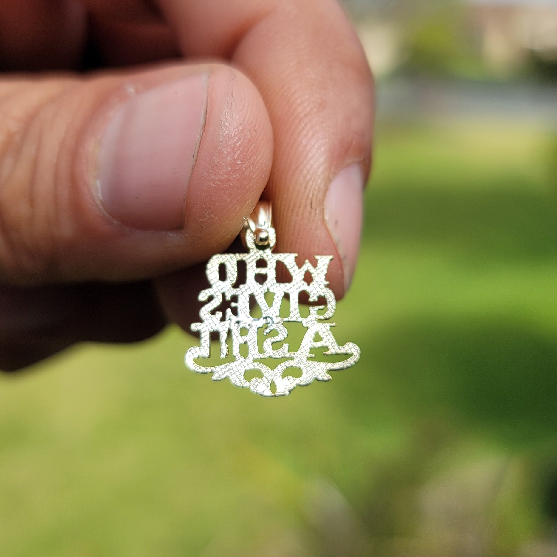 This gorgeous sterling silver 925 "who gives a shit" saying pendant. This sterling silver pendant measures 19 mm in length by 17 mm in width. Measurement includes bale. Allow 7-10 business days for item to ship out.