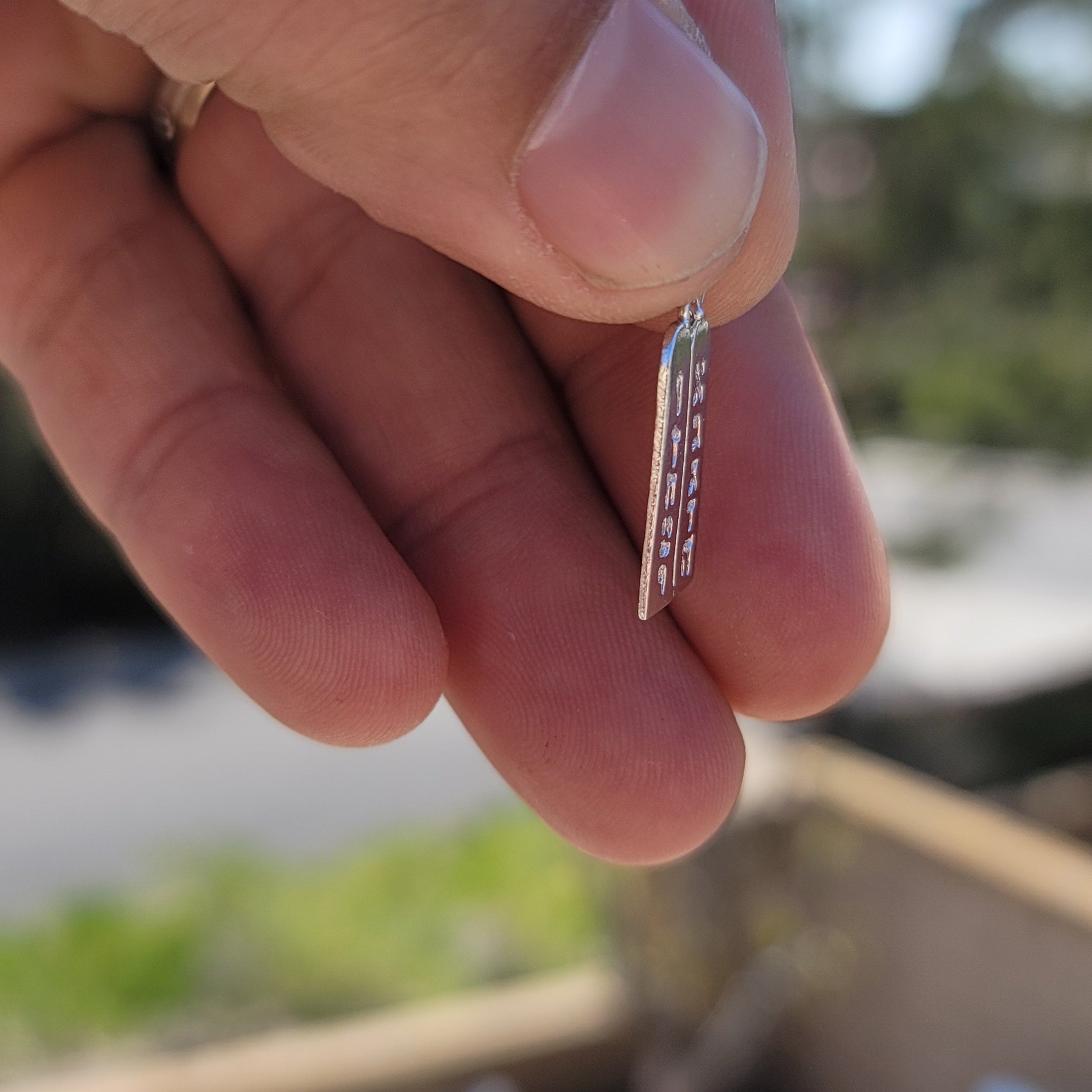 This is a stunning sterling silver 925 ten commandments pendant. This sterling silver pendant measures 25 mm in length by 10 mm in width. Measurement includes bale. Allow 7-10 bussiness days for item to ship out.